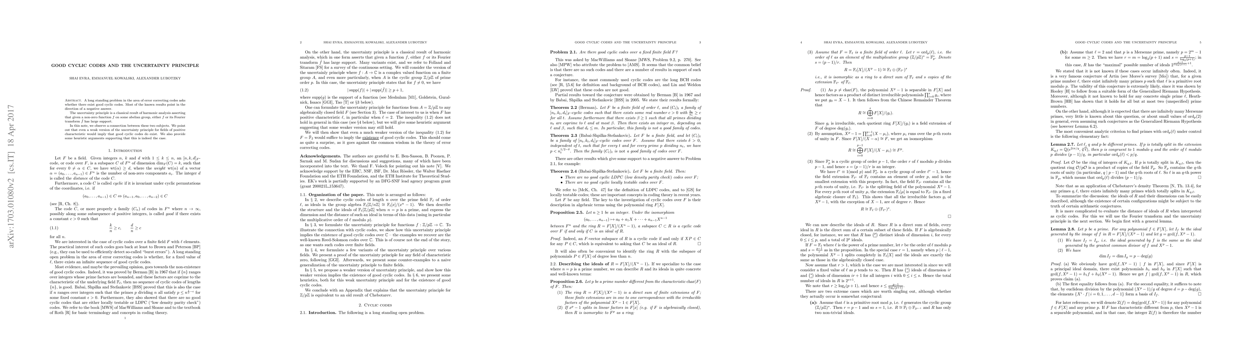 A long standing problem in the area of error correcting codes asks whether there exist good cyclic codes. Most of the known results point in the direction of a negative answer. The uncertainty principle is a classical result of harmonic analysis asserting that given a non-zero function $f$ on some abelian group, either $f$ or its Fourier transform $\hat{f}$ has large support. In this note, we observe a connection between these two subjects. We point out that even a weak version of the uncertainty principle for fields of positive characteristic would imply that good cyclic codes do exist. We also provide some heuristic arguments supporting that this is indeed the case.