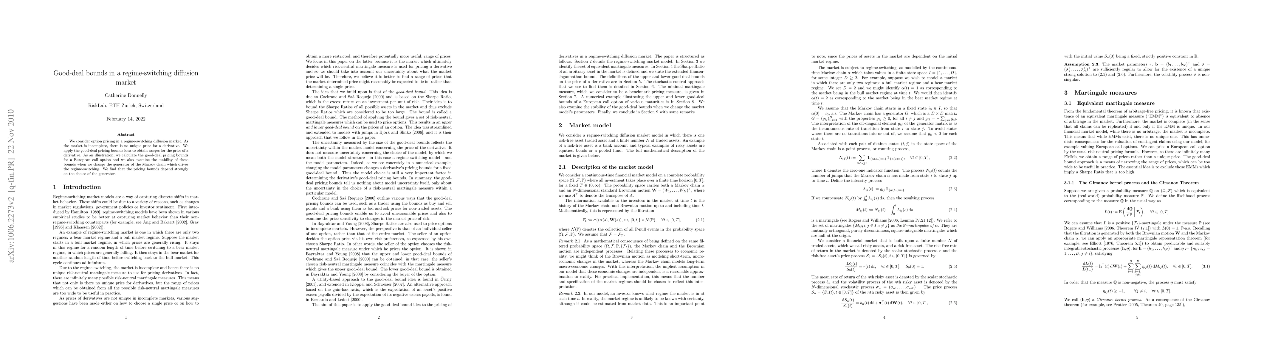 This paper explores option pricing in an incomplete regime-switching diffusion market using good-deal pricing bounds to determine price ranges. It calculates these bounds for a European call option and finds that the bounds' stability and dependence are significantly influenced by the Markov chain's generator.