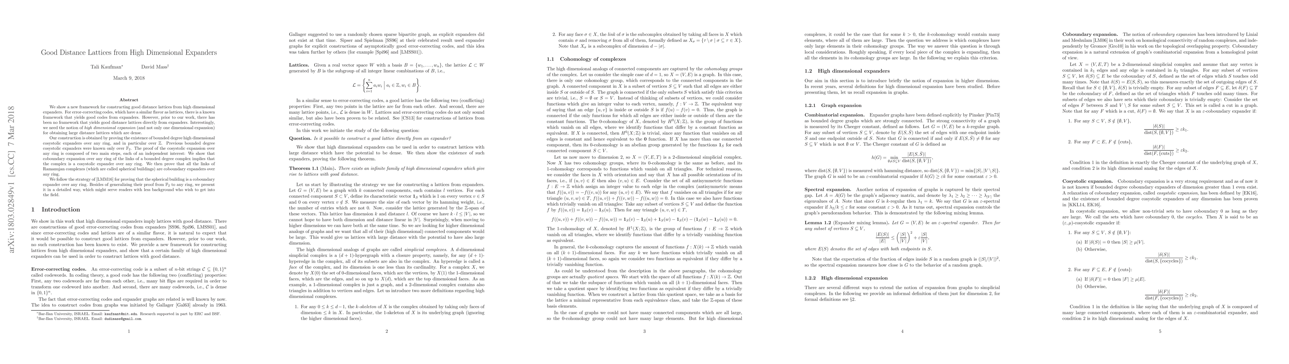 This paper introduces a new framework for creating good distance lattices from high dimensional expanders, specifically bounded degree high dimensional cosystolic expanders over $\mathbb{Z}$. It proves the existence of these expanders and generalizes prior work that was limited to $\mathbb{F}_2$, aiming to provide dense and large distance lattices.