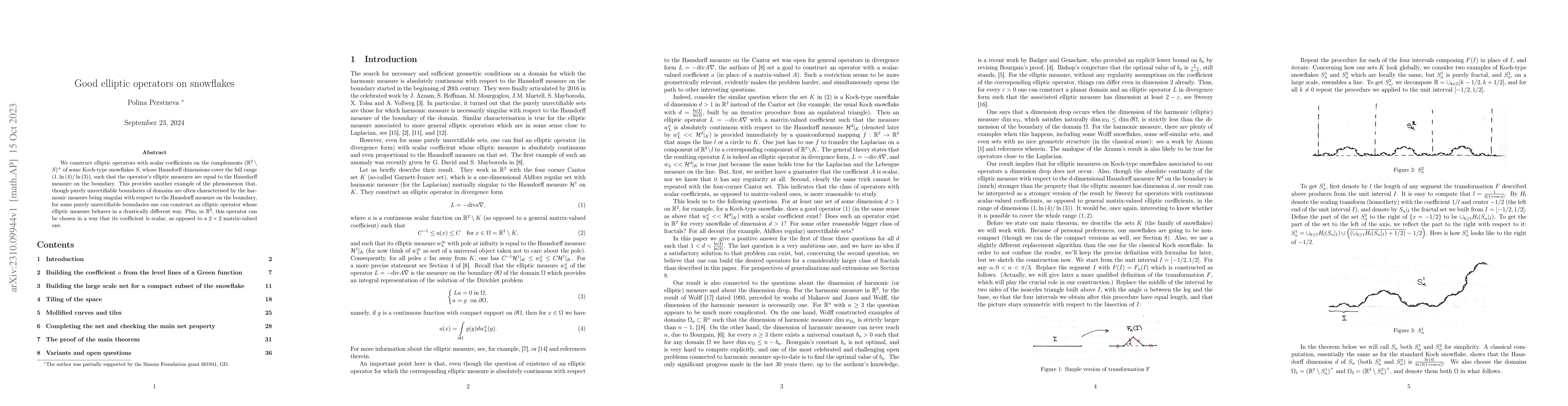 This paper constructs elliptic operators on the complements of Koch-type snowflakes in $\mathbb{R}^2$ with Hausdorff dimensions ranging from 1 to $\ln{(4)}/\ln{(3)}$, where the elliptic measures match the Hausdorff measure on the boundary. This demonstrates that for some unrectifiable boundaries, elliptic operators can exhibit different behavior compared to the typical singular harmonic measure.