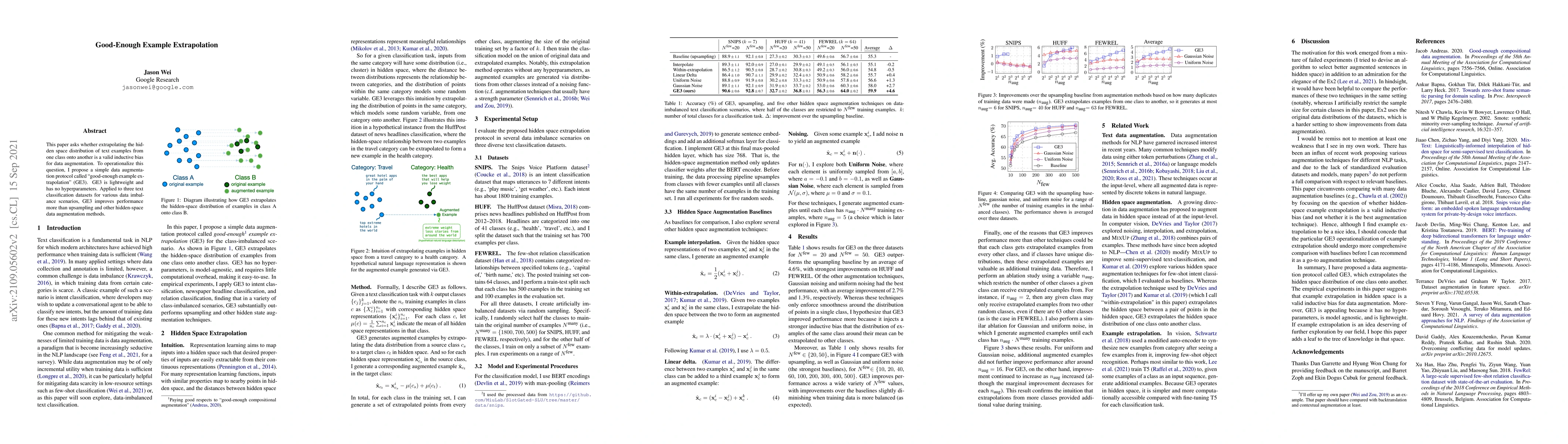 This paper asks whether extrapolating the hidden space distribution of text examples from one class onto another is a valid inductive bias for data augmentation. To operationalize this question, I propose a simple data augmentation protocol called "good-enough example extrapolation" (GE3). GE3 is lightweight and has no hyperparameters. Applied to three text classification datasets for various data imbalance scenarios, GE3 improves performance more than upsampling and other hidden-space data augmentation methods.