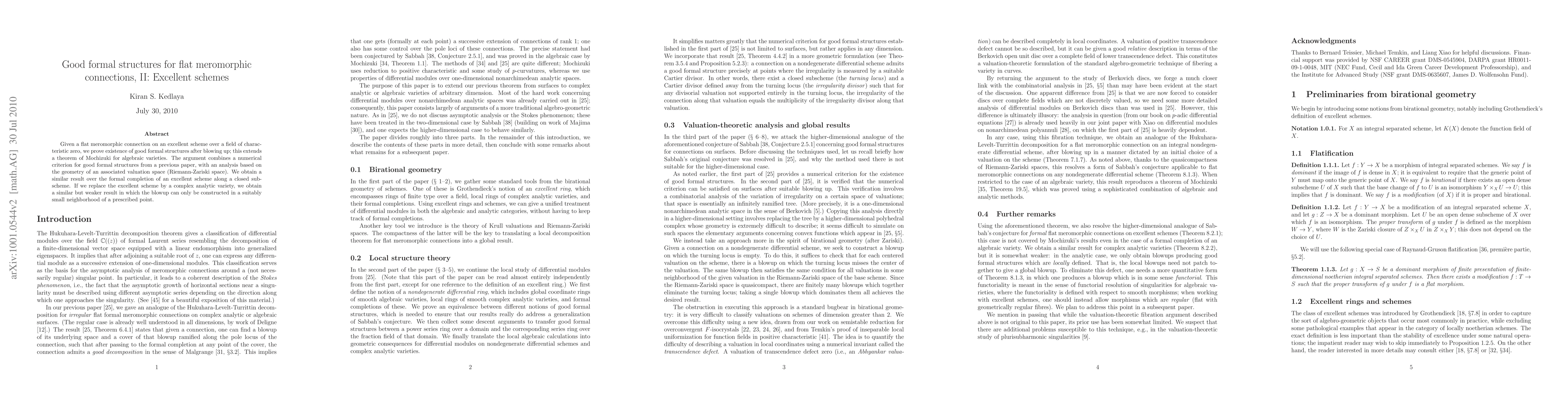 This paper proves the existence of good formal structures for flat meromorphic connections on excellent schemes after blowing up, extending a theorem by Mochizuki. It combines a numerical criterion with geometric analysis based on the Riemann-Zariski space, yielding similar results over formal completions and weaker results for complex analytic varieties.