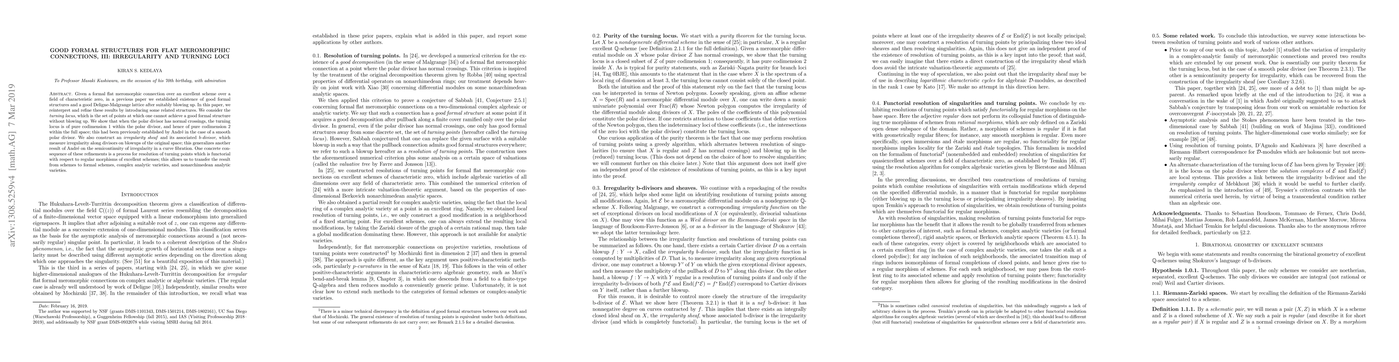 Given a formal flat meromorphic connection over an excellent scheme over a field of characteristic zero, in a previous paper we established existence of good formal structures and a good Deligne-Malgrange lattice after suitably blowing up. In this paper, we reinterpret and refine these results by introducing some related structures. We consider the turning locus, which is the set of points at which one cannot achieve a good formal structure without blowing up. We show that when the polar divisor has normal crossings, the turning locus is of pure codimension 1 within the polar divisor, and hence of pure codimension 2 within the full space; this had been previously established by Andre in the case of a smooth polar divisor. We also construct an irregularity sheaf and its associated b-divisor, which measure irregularity along divisors on blowups of the original space; this generalizes another result of Andre on the semicontinuity of irregularity in a curve fibration. One concrete consequence of these refinements is a process for resolution of turning points which is functorial with respect to regular morphisms of excellent schemes; this allows us to transfer the result from schemes to formal schemes, complex analytic varieties, and nonarchimedean analytic varieties.