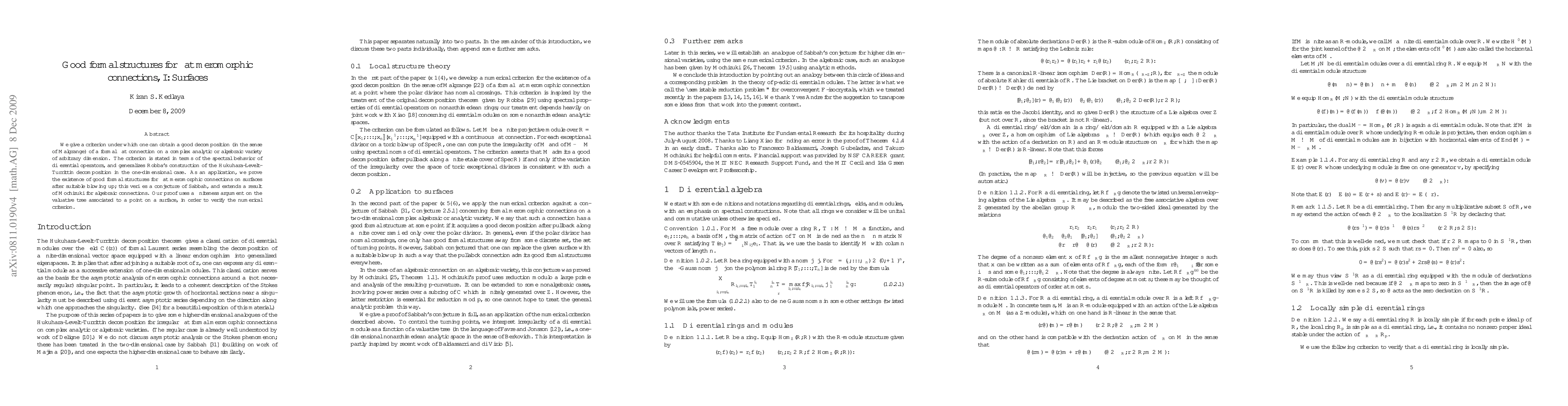 We give a criterion under which one can obtain a good decomposition (in the sense of Malgrange) of a formal flat connection on a complex analytic or algebraic variety of arbitrary dimension. The criterion is stated in terms of the spectral behavior of differential operators, and generalizes Robba's construction of the Hukuhara-Levelt-Turrittin decomposition in the one-dimensional case. As an application, we prove the existence of good formal structures for flat meromorphic connections on surfaces after suitable blowing up; this verifies a conjecture of Sabbah, and extends a result of Mochizuki for algebraic connections. Our proof uses a finiteness argument on the valuative tree associated to a point on a surface, in order to verify the numerical criterion.