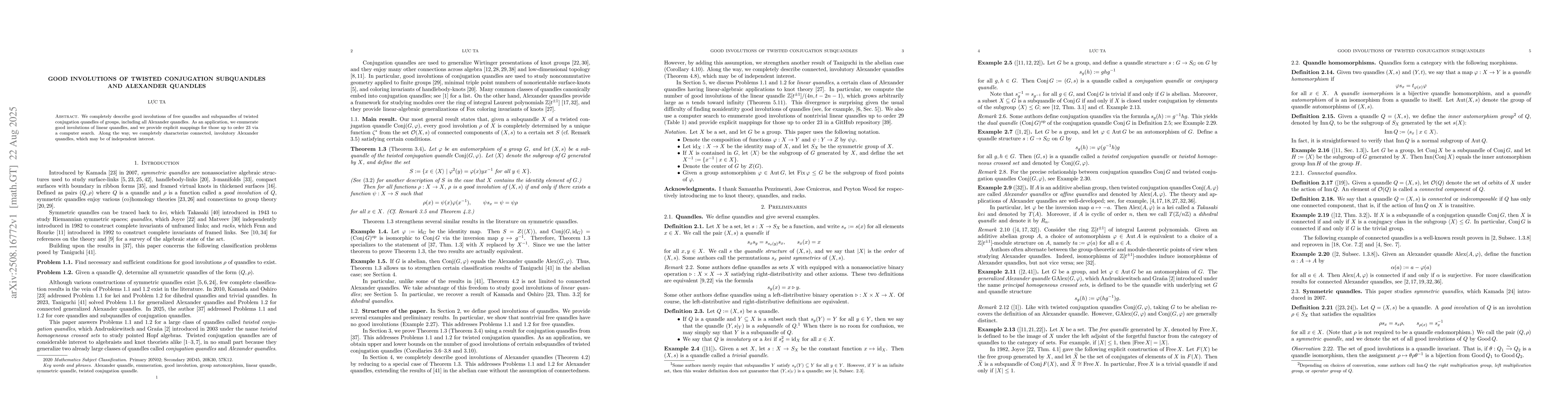 We completely describe good involutions of free quandles and subquandles of twisted conjugation quandles of groups, including all Alexander quandles. As an application, we enumerate good involutions of linear quandles, and we provide explicit mappings for those up to order 23 via a computer search. Along the way, we completely characterize connected, involutory Alexander quandles, which may be of independent interest.