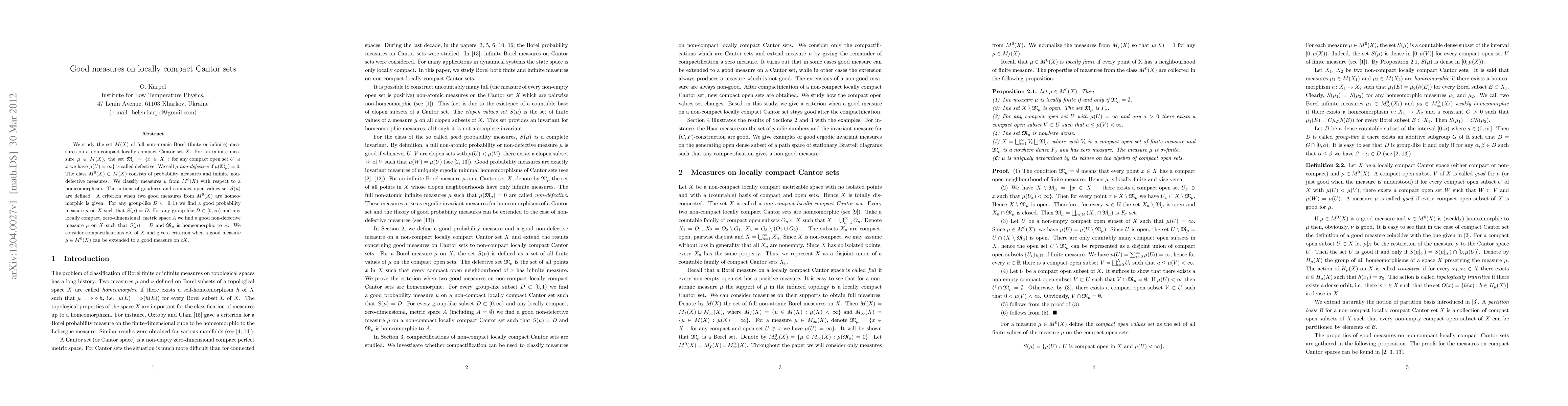 The paper introduces the concept of 'goodness' for measures on locally compact Cantor sets, along with criteria for homeomorphism and extension to compactifications.