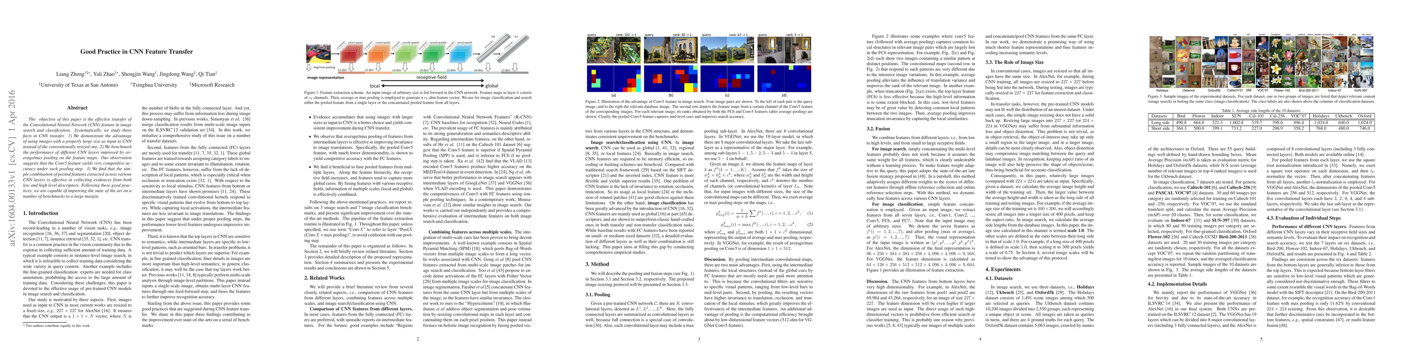 The objective of this paper is the effective transfer of the Convolutional Neural Network (CNN) feature in image search and classification. Systematically, we study three facts in CNN transfer. 1) We demonstrate the advantage of using images with a properly large size as input to CNN instead of the conventionally resized one. 2) We benchmark the performance of different CNN layers improved by average/max pooling on the feature maps. Our observation suggests that the Conv5 feature yields very competitive accuracy under such pooling step. 3) We find that the simple combination of pooled features extracted across various CNN layers is effective in collecting evidences from both low and high level descriptors. Following these good practices, we are capable of improving the state of the art on a number of benchmarks to a large margin.