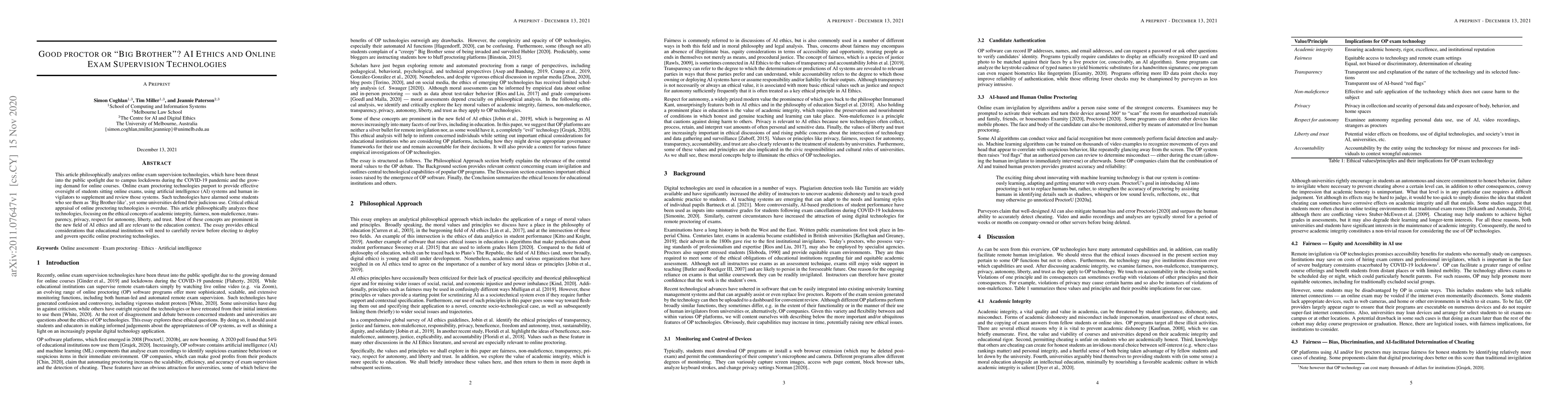 This article philosophically analyzes online exam supervision technologies, which have been thrust into the public spotlight due to campus lockdowns during the COVID-19 pandemic and the growing demand for online courses. Online exam proctoring technologies purport to provide effective oversight of students sitting online exams, using artificial intelligence (AI) systems and human invigilators to supplement and review those systems. Such technologies have alarmed some students who see them as `Big Brother-like', yet some universities defend their judicious use. Critical ethical appraisal of online proctoring technologies is overdue. This article philosophically analyzes these technologies, focusing on the ethical concepts of academic integrity, fairness, non-maleficence, transparency, privacy, respect for autonomy, liberty, and trust. Most of these concepts are prominent in the new field of AI ethics and all are relevant to the education context. The essay provides ethical considerations that educational institutions will need to carefully review before electing to deploy and govern specific online proctoring technologies.