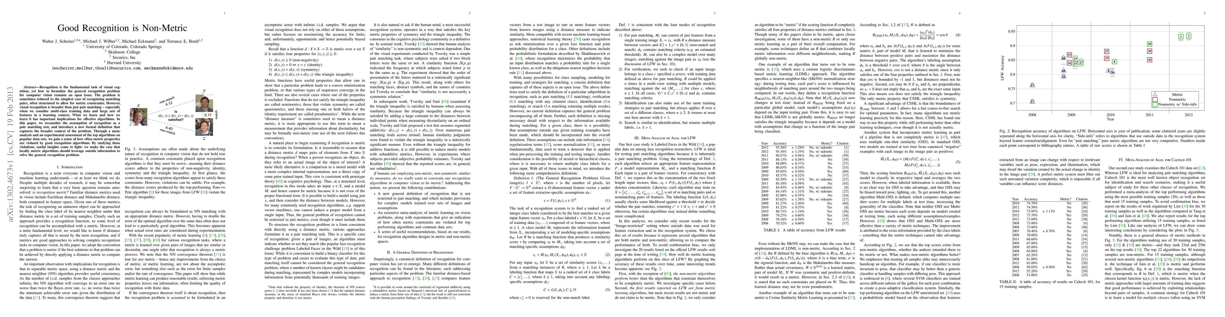 Recognition is the fundamental task of visual cognition, yet how to formalize the general recognition problem for computer vision remains an open issue. The problem is sometimes reduced to the simplest case of recognizing matching pairs, often structured to allow for metric constraints. However, visual recognition is broader than just pair matching -- especially when we consider multi-class training data and large sets of features in a learning context. What we learn and how we learn it has important implications for effective algorithms. In this paper, we reconsider the assumption of recognition as a pair matching test, and introduce a new formal definition that captures the broader context of the problem. Through a meta-analysis and an experimental assessment of the top algorithms on popular data sets, we gain a sense of how often metric properties are violated by good recognition algorithms. By studying these violations, useful insights come to light: we make the case that locally metric algorithms should leverage outside information to solve the general recognition problem.