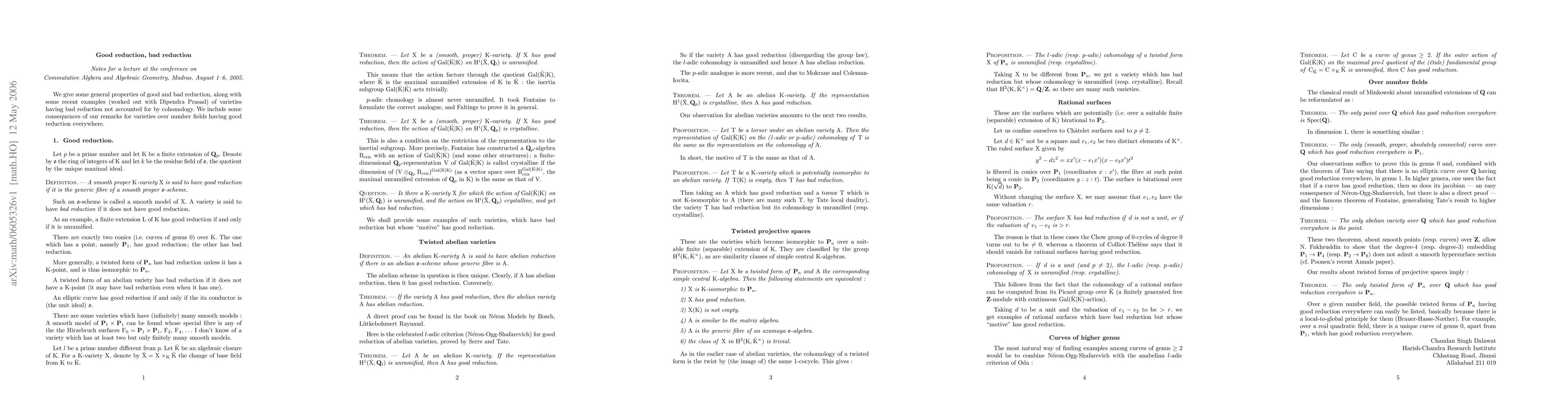 We give some general properties of good and bad reduction, and some recent examples (worked out with Dipendra Prasad) of varieties having bad reduction not accounted for by their cohomology. We include some consequences of our remarks for varieties over number fields having good reduction everywhere.