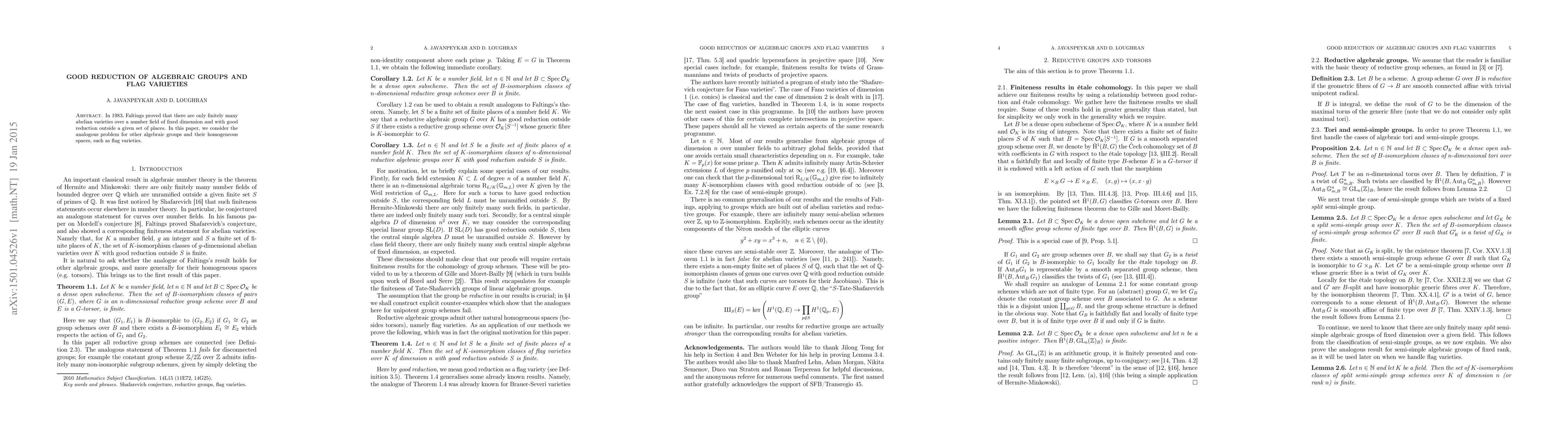This paper extends Faltings' theorem on the good reduction of abelian varieties to algebraic groups and their homogeneous spaces, specifically focusing on flag varieties over number fields. It establishes finiteness results for these groups with good reduction outside a specified set of places.