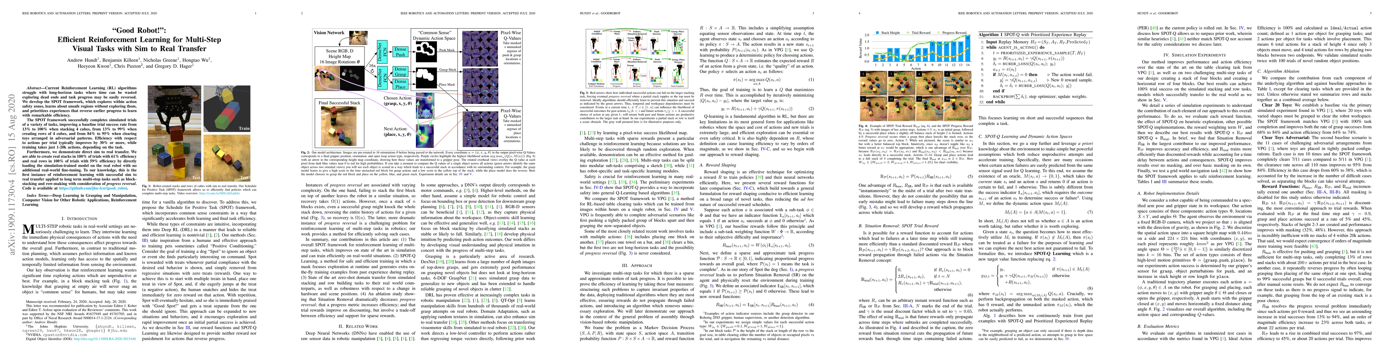 Current Reinforcement Learning (RL) algorithms struggle with long-horizon tasks where time can be wasted exploring dead ends and task progress may be easily reversed. We develop the SPOT framework, which explores within action safety zones, learns about unsafe regions without exploring them, and prioritizes experiences that reverse earlier progress to learn with remarkable efficiency. The SPOT framework successfully completes simulated trials of a variety of tasks, improving a baseline trial success rate from 13% to 100% when stacking 4 cubes, from 13% to 99% when creating rows of 4 cubes, and from 84% to 95% when clearing toys arranged in adversarial patterns. Efficiency with respect to actions per trial typically improves by 30% or more, while training takes just 1-20k actions, depending on the task. Furthermore, we demonstrate direct sim to real transfer. We are able to create real stacks in 100% of trials with 61% efficiency and real rows in 100% of trials with 59% efficiency by directly loading the simulation-trained model on the real robot with no additional real-world fine-tuning. To our knowledge, this is the first instance of reinforcement learning with successful sim to real transfer applied to long term multi-step tasks such as block-stacking and row-making with consideration of progress reversal. Code is available at https://github.com/jhu-lcsr/good_robot .