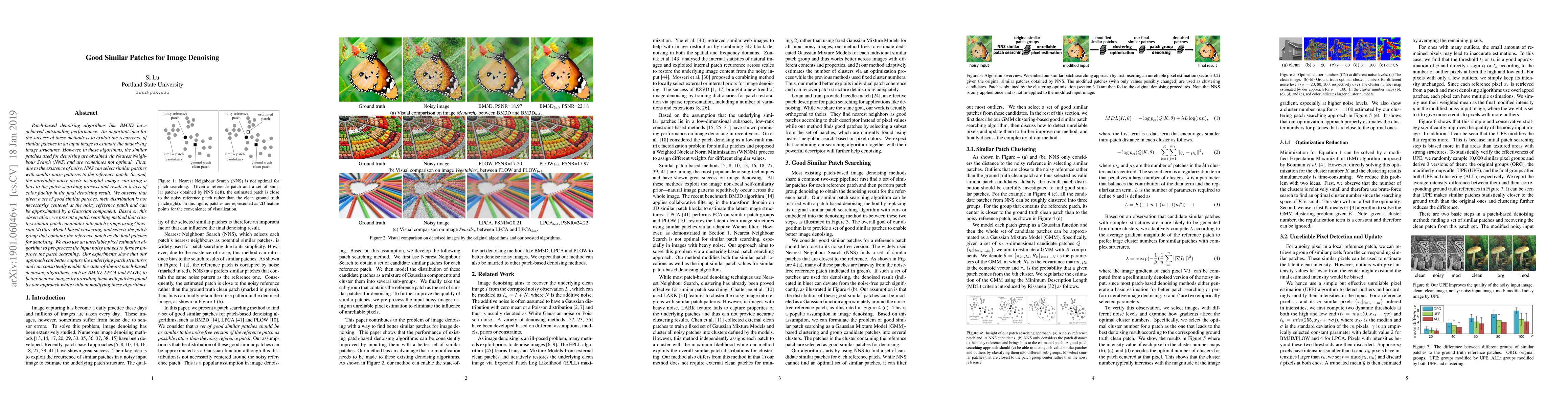 This paper proposes a novel patch searching method for image denoising that uses Gaussian Mixture Model-based clustering to identify optimal sets of similar patches, improving upon traditional Nearest Neighbor Search. The method also incorporates an unreliable pixel estimation algorithm to enhance image preprocessing, leading to better denoising performance for algorithms like BM3D, LPCA, and PLOW.