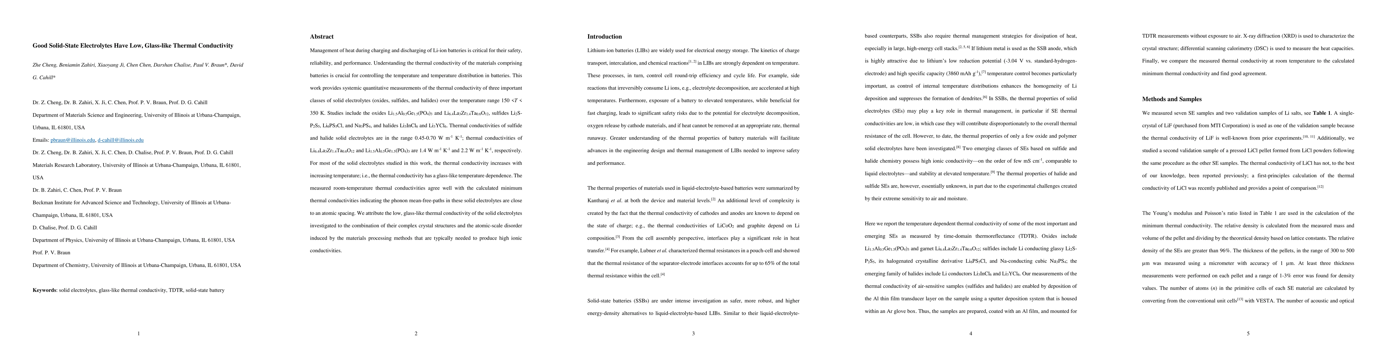 This study systematically measures the thermal conductivity of various solid electrolytes used in Li-ion batteries, finding that sulfide and halide electrolytes exhibit low, glass-like thermal conductivities, while oxides show higher values. The low thermal conductivity is attributed to the materials' complex crystal structures and atomic-scale disorder.