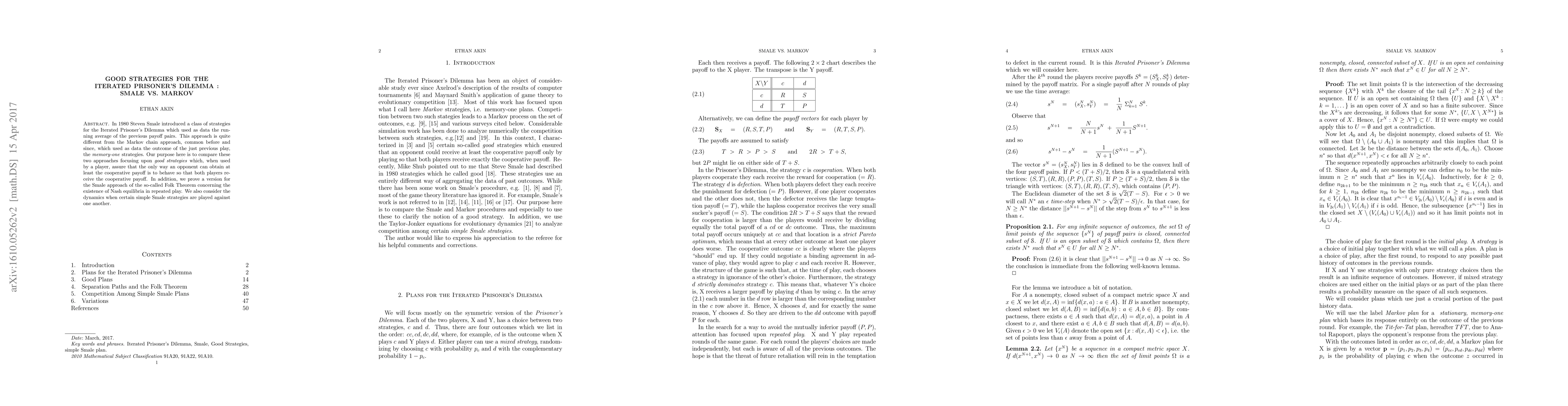 In 1980 Steven Smale introduced a class of strategies for the Iterated Prisoner's Dilemma which used as data the running average of the previous payoff pairs. This approach is quite different from the Markov chain approach, common before and since, which used as data the outcome of the just previous play, the memory-one strategies. Our purpose here is to compare these two approaches focusing upon good strategies which, when used by a player, assure that the only way an opponent can obtain at least the cooperative payoff is to behave so that both players receive the cooperative payoff. In addition, we prove a version for the Smale approach of the so-called Folk Theorem concerning the existence of Nash equilibria in repeated play. We also consider the dynamics when certain simple Smale strategies are played against one another.