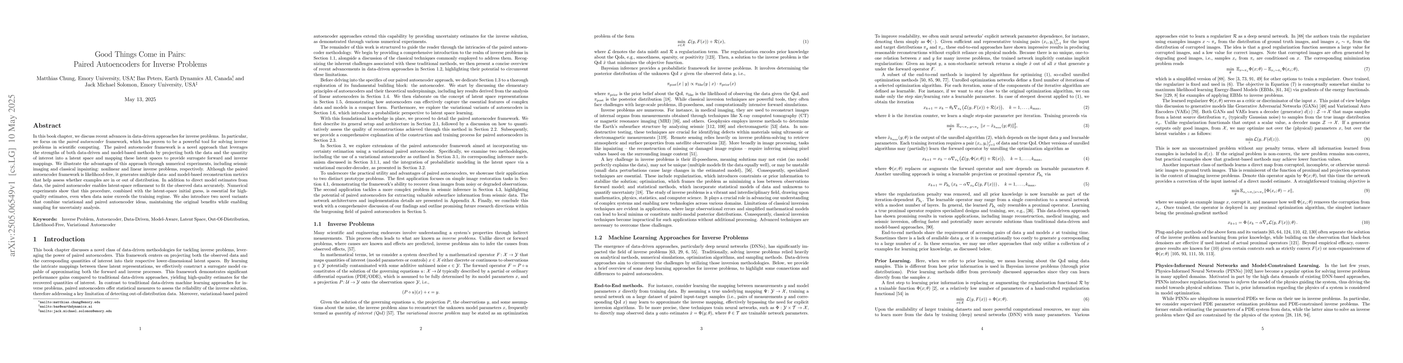 In this book chapter, we discuss recent advances in data-driven approaches for inverse problems. In particular, we focus on the \emph{paired autoencoder} framework, which has proven to be a powerful tool for solving inverse problems in scientific computing. The paired autoencoder framework is a novel approach that leverages the strengths of both data-driven and model-based methods by projecting both the data and the quantity of interest into a latent space and mapping these latent spaces to provide surrogate forward and inverse mappings. We illustrate the advantages of this approach through numerical experiments, including seismic imaging and classical inpainting: nonlinear and linear inverse problems, respectively. Although the paired autoencoder framework is likelihood-free, it generates multiple data- and model-based reconstruction metrics that help assess whether examples are in or out of distribution. In addition to direct model estimates from data, the paired autoencoder enables latent-space refinement to fit the observed data accurately. Numerical experiments show that this procedure, combined with the latent-space initial guess, is essential for high-quality estimates, even when data noise exceeds the training regime. We also introduce two novel variants that combine variational and paired autoencoder ideas, maintaining the original benefits while enabling sampling for uncertainty analysis.