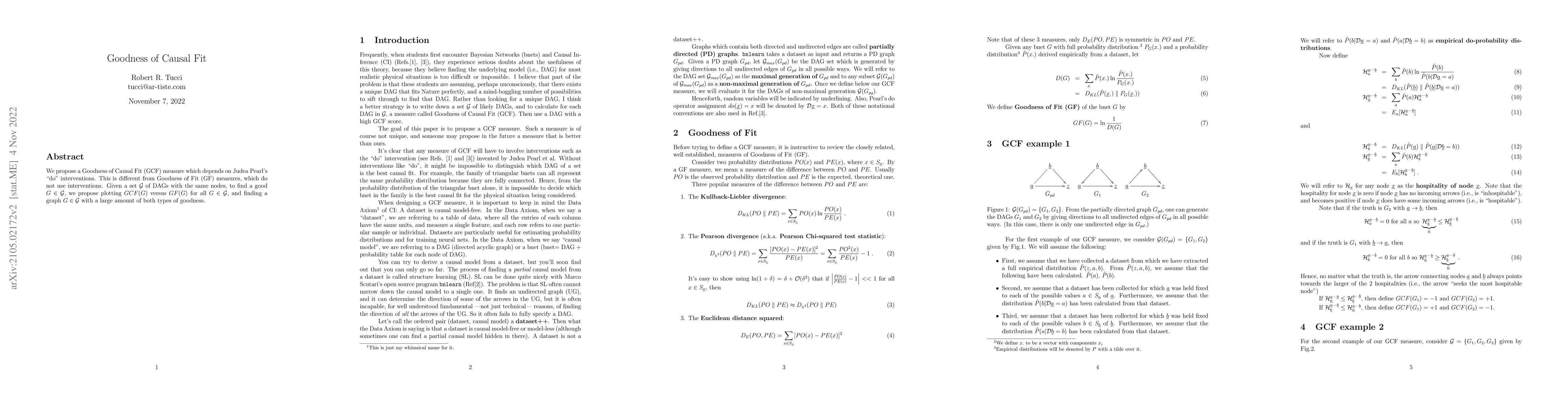 We propose a Goodness of Causal Fit (GCF) measure which depends on Judea Pearl's ``do" interventions. This is different from Goodness of Fit (GF) measures, which do not use interventions. Given a set ${\cal G}$ of DAGs with the same nodes, to find a good $G\in {\cal G}$, we propose plotting $GCF(G)$ versus $GF(G)$ for all $G\in {\cal G}$, and finding a graph $G\in {\cal G}$ with a large amount of both types of goodness.