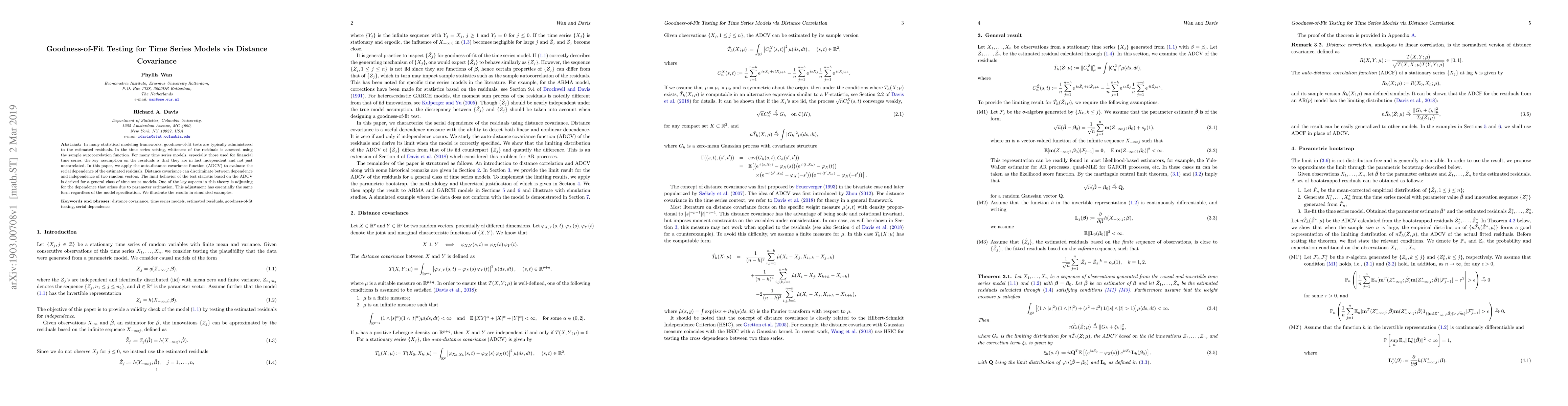 This paper proposes a goodness-of-fit test for time series models using the auto-distance covariance function (ADCV) to assess serial dependence in residuals, distinguishing between dependence and independence. The test statistic's limit behavior is derived, accounting for parameter estimation dependence, and demonstrated through simulated examples.