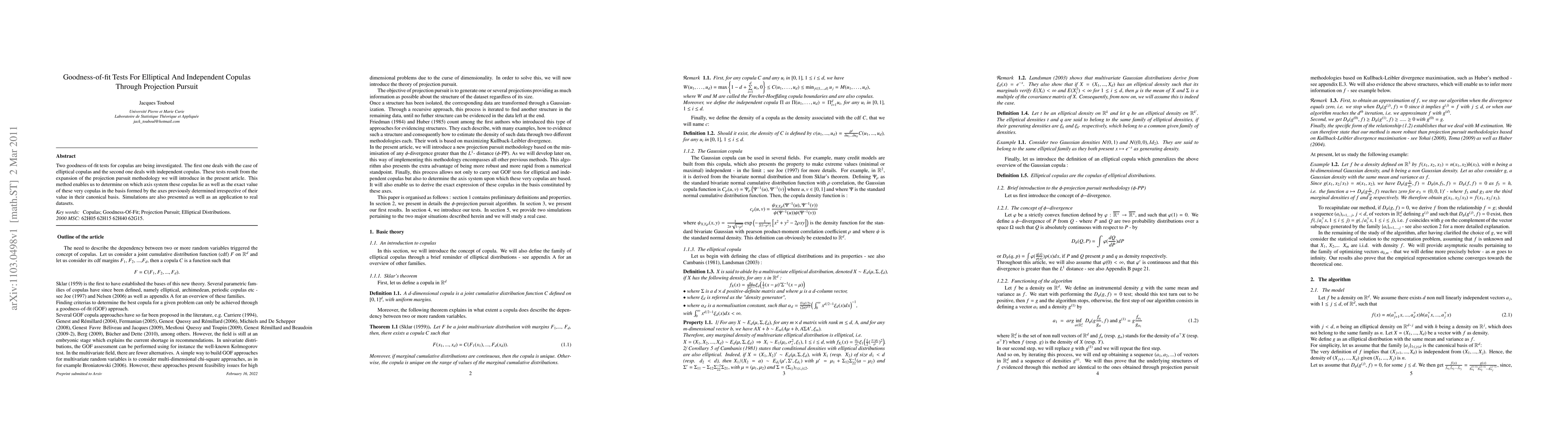 This paper proposes two goodness-of-fit tests for elliptical and independent copulas using a projection pursuit methodology. The tests determine the axis system and exact values of the copulas, and are validated through simulations and real dataset applications.