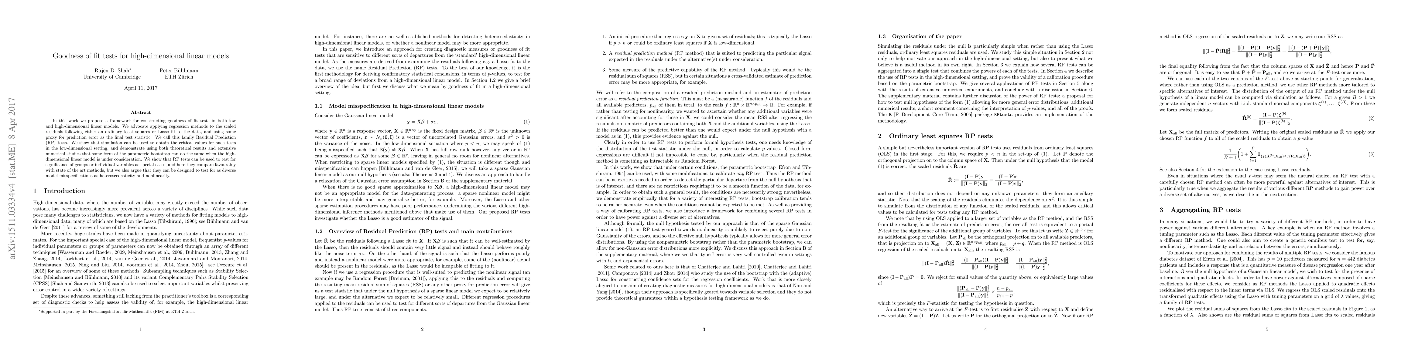 This paper proposes Residual Prediction (RP) tests for assessing goodness of fit in both low and high-dimensional linear models, using regression on scaled residuals and a proxy for prediction error. It demonstrates the effectiveness of RP tests through theoretical results and numerical studies, showing they can outperform existing methods and test for various model misspecifications.