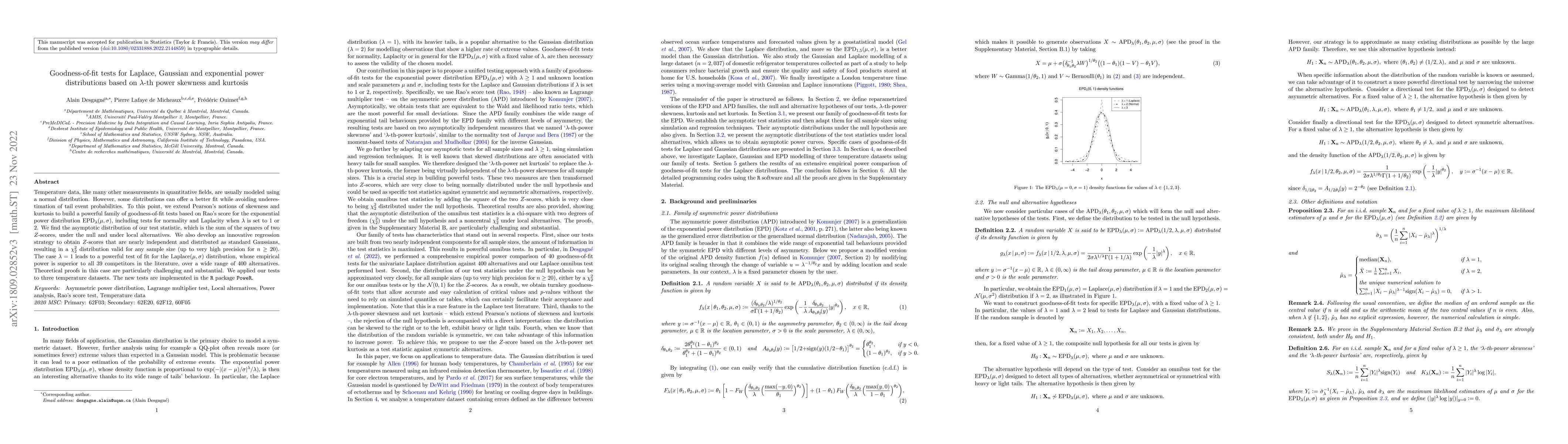 Temperature data, like many other measurements in quantitative fields, are usually modeled using a normal distribution. However, some distributions can offer a better fit while avoiding underestimation of tail event probabilities. To this point, we extend Pearson's notions of skewness and kurtosis to build a powerful family of goodness-of-fit tests based on Rao's score for the exponential power distribution $\mathrm{EPD}_{\lambda}(\mu,\sigma)$, including tests for normality and Laplacity when $\lambda$ is set to 1 or 2. We find the asymptotic distribution of our test statistic, which is the sum of the squares of two $Z$-scores, under the null and under local alternatives. We also develop an innovative regression strategy to obtain $Z$-scores that are nearly independent and distributed as standard Gaussians, resulting in a $\chi_2^2$ distribution valid for any sample size (up to very high precision for $n\geq 20$). The case $\lambda=1$ leads to a powerful test of fit for the Laplace($\mu,\sigma$) distribution, whose empirical power is superior to all $39$ competitors in the literature, over a wide range of $400$ alternatives. Theoretical proofs in this case are particularly challenging and substantial. We applied our tests to three temperature datasets. The new tests are implemented in the R package PoweR.