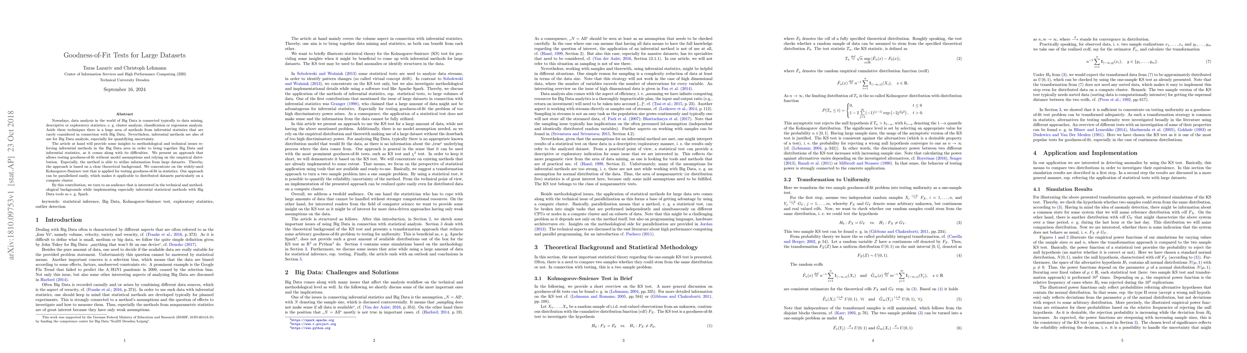 Nowadays, data analysis in the world of Big Data is connected typically to data mining, descriptive or exploratory statistics, e.~g.\ cluster analysis, classification or regression analysis. Aside these techniques there is a huge area of methods from inferential statistics that are rarely considered in connection with Big Data. Nevertheless, inferential methods are also of use for Big Data analysis, especially for quantifying uncertainty. The article at hand will provide some insights to methodological and technical issues referring inferential methods in the Big Data area in order to bring together Big Data and inferential statistics, as it comes along with its difficulties. We present an approach that allows testing goodness-of-fit without model assumptions and relying on the empirical distribution. Especially, the method is able to utilize information from large datasets. Thereby, the approach is based on a clear theoretical background. We concentrate on the widely-used Kolmogorov-Smirnov test that is applied for testing goodness-of-fit in statistics. Our approach can be parallelized easily, which makes it applicable to distributed datasets particularly on a compute cluster. By this contribution, we turn to an audience that is interested in the technical and methodological backgrounds while implementing especially inferential statistical methods with Big Data tools as e. g. Spark.
