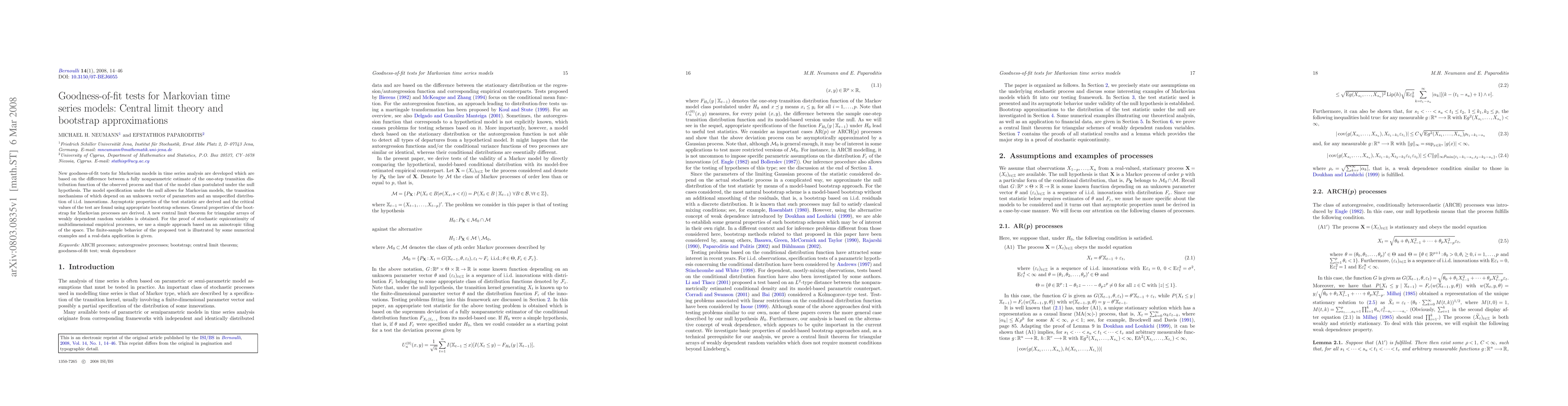 This paper develops new goodness-of-fit tests for Markovian time series models based on the difference between observed and modeled transition distributions, with asymptotic properties derived and critical values obtained via bootstrap methods. The study also establishes a new central limit theorem for weakly dependent random variables and evaluates the test's performance through numerical examples and real-data applications.