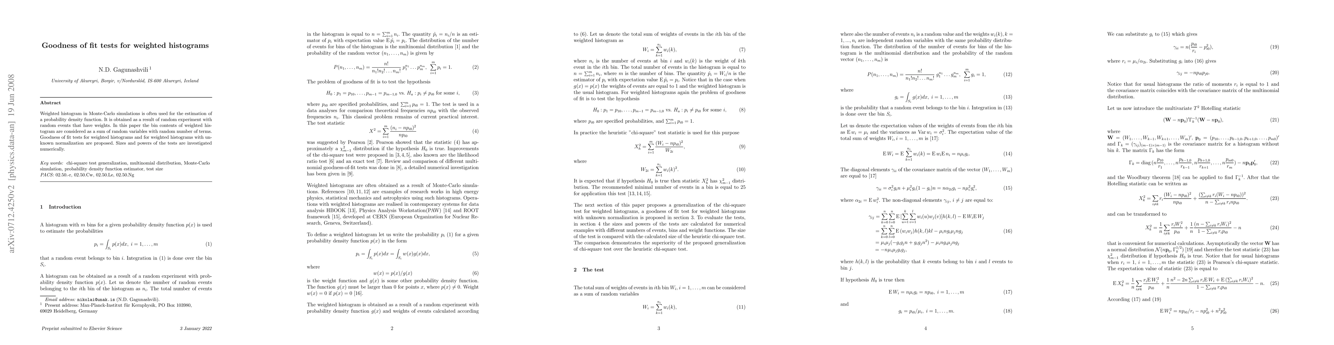 This paper proposes new goodness of fit tests for weighted histograms used in Monte-Carlo simulations, especially when the histograms have unknown normalization. The performance of these tests, including their sizes and powers, is analyzed through numerical investigations.