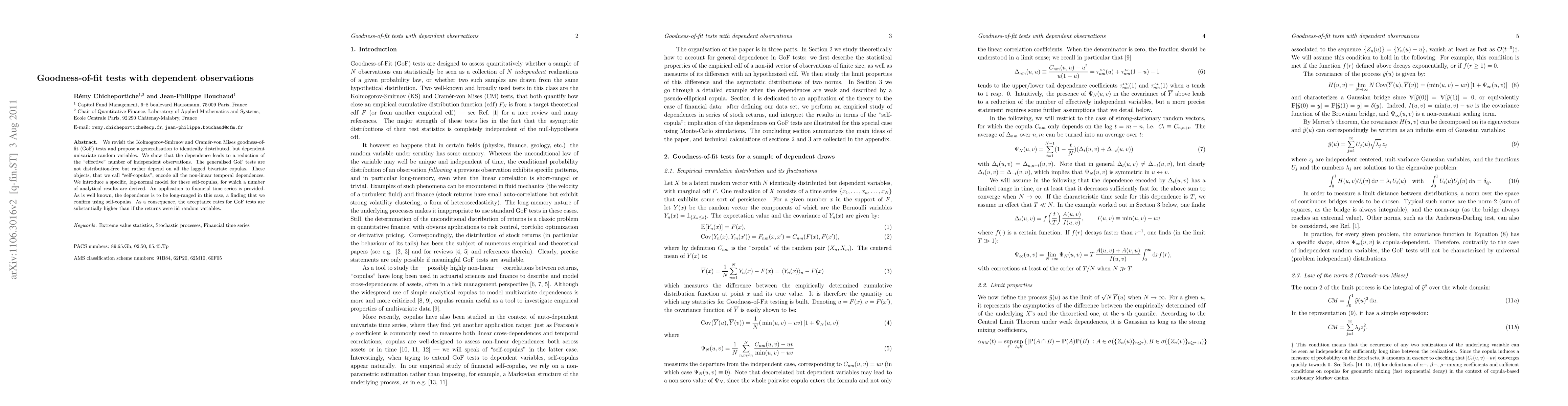 We revisit the Kolmogorov-Smirnov and Cram\'er-von Mises goodness-of-fit (GoF) tests and propose a generalisation to identically distributed, but dependent univariate random variables. We show that the dependence leads to a reduction of the "effective" number of independent observations. The generalised GoF tests are not distribution-free but rather depend on all the lagged bivariate copulas. These objects, that we call "self-copulas", encode all the non-linear temporal dependences. We introduce a specific, log-normal model for these self-copulas, for which a number of analytical results are derived. An application to financial time series is provided. As is well known, the dependence is to be long-ranged in this case, a finding that we confirm using self-copulas. As a consequence, the acceptance rates for GoF tests are substantially higher than if the returns were iid random variables.