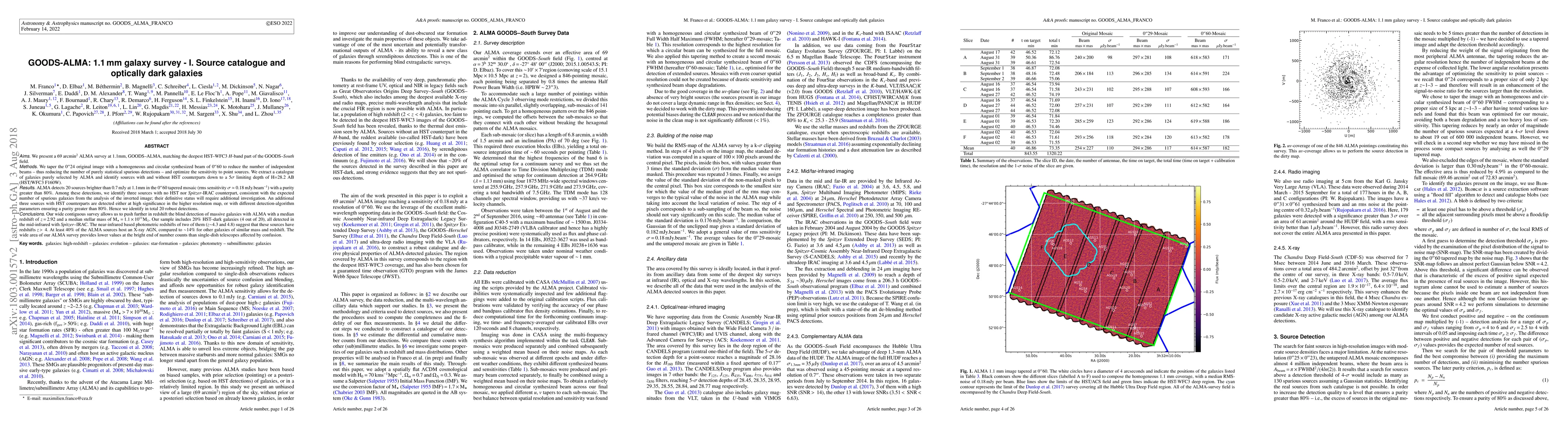 We present a 69 arcmin$^2$ ALMA survey at 1.1mm, GOODS-ALMA, matching the deepest HST-WFC3 H-band part of the GOODS-South field. We taper the 0"24 original image with a homogeneous and circular synthesized beam of 0"60 to reduce the number of independent beams - thus reducing the number of purely statistical spurious detections - and optimize the sensitivity to point sources. We extract a catalogue of galaxies purely selected by ALMA and identify sources with and without HST counterparts down to a 5$\sigma$ limiting depth of H=28.2 AB (HST/WFC3 F160W). ALMA detects 20 sources brighter than 0.7 mJy in the 0"60 tapered mosaic (rms sensitivity =0.18 mJy/beam) with a purity greater than 80%. Among these detections, we identify three sources with no HST nor Spitzer-IRAC counterpart, consistent with the expected number of spurious galaxies from the analysis of the inverted image; their definitive status will require additional investigation. An additional three sources with HST counterparts are detected either at high significance in the higher resolution map, or with different detection-algorithm parameters ensuring a purity greater than 80%. Hence we identify in total 20 robust detections. Our wide contiguous survey allows us to push further in redshift the blind detection of massive galaxies with ALMA with a median redshift of $z$=2.92 and a median stellar mass of M$_{\star}$ = 1.1 $\times 10^{11}$M$_\odot$. Our sample includes 20% HST-dark galaxies (4 out of 20), all detected in the mid-infrared with IRAC. The near-infrared based photometric redshifts of two of them $z\sim$4.3 and 4.8) suggest that these sources have redshifts $z$>4. At least 40% of the ALMA sources host an X-ray AGN, compared to 14% for other galaxies of similar mass and redshift. The wide area of our ALMA survey provides lower values at the bright end of number counts than single-dish telescopes