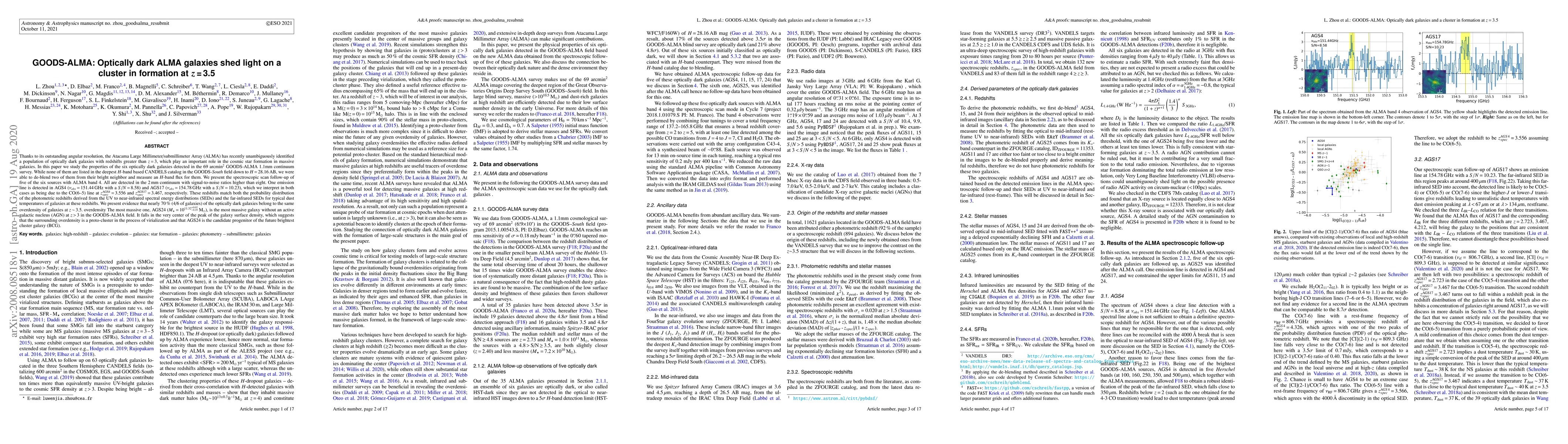 In this paper we study the properties of the six optically dark galaxies detected in the 69 arcmin^2 GOODS-ALMA 1.1mm continuum survey. While none of them are listed in the deepest H-band based CANDELS catalog in the GOODS-South field down to H=28.16AB, we were able to de-blend two of them from their bright neighbor and measure an $H$-band flux for them. We note that AGS4 and AGS15 have H=25.23, 27.11AB respectively. Their extreme proximity (0.50", 0.27") to a bright optical source and their extreme faintness prevented them from being included in the H-band catalog. We present the spectroscopic scan follow-up of five of the six sources with ALMA band 4. All are detected in the 2mm continuum with signal-to-noise ratios higher than eight. One emission line is detected in AGS4 (\nu_{obs} =151.44GHz with a S/N=8.58) and AGS17 (\nu_{obs} =154.78GHz with a S/N=10.23), which we interpret in both cases as being due to the CO(6-5) line at z^{AGS4}_{spec}=3.556 and z^{AGS4}_{spec}=3.467, respectively. These redshifts match both the probability distribution of the photometric redshifts derived from the UV to near-infrared spectral energy distributions (SEDs) and the far-infrared SEDs for typical dust temperatures of galaxies at these redshifts. We present evidence that nearly 70% (4/6 of galaxies) of the optically dark galaxies belong to the same overdensity of galaxies at z~3.5. overdensity The most massive one, AGS24 (M_{\star} = 10^{11.32^{+0.02}_{-0.19}} M_{\odot}), is the most massive galaxy without an active galactic nucleus (AGN) at $z$\,>\,3 in the GOODS-ALMA field. It falls in the very center of the peak of the galaxy surface density, which suggests that the surrounding overdensity is a proto-cluster in the process of virialization and that AGS24 is the candidate progenitor of the future brightest cluster galaxy (BCG).