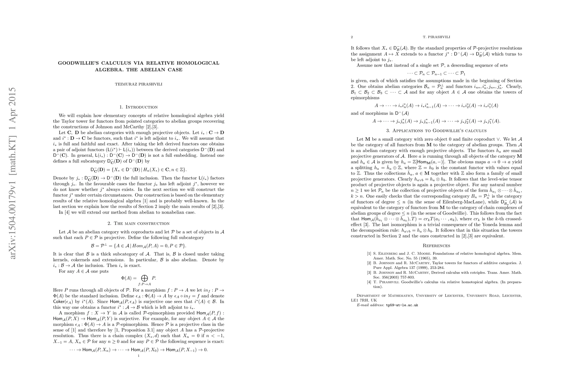 Summary: This paper utilizes concepts from relative homological algebra to construct Goodwillie's Taylor tower for functors from pointed categories to abelian groups, echoing Johnson and McCarthy's constructions. It leverages relative homological algebra for a new perspective on the Taylor expansion of functors.