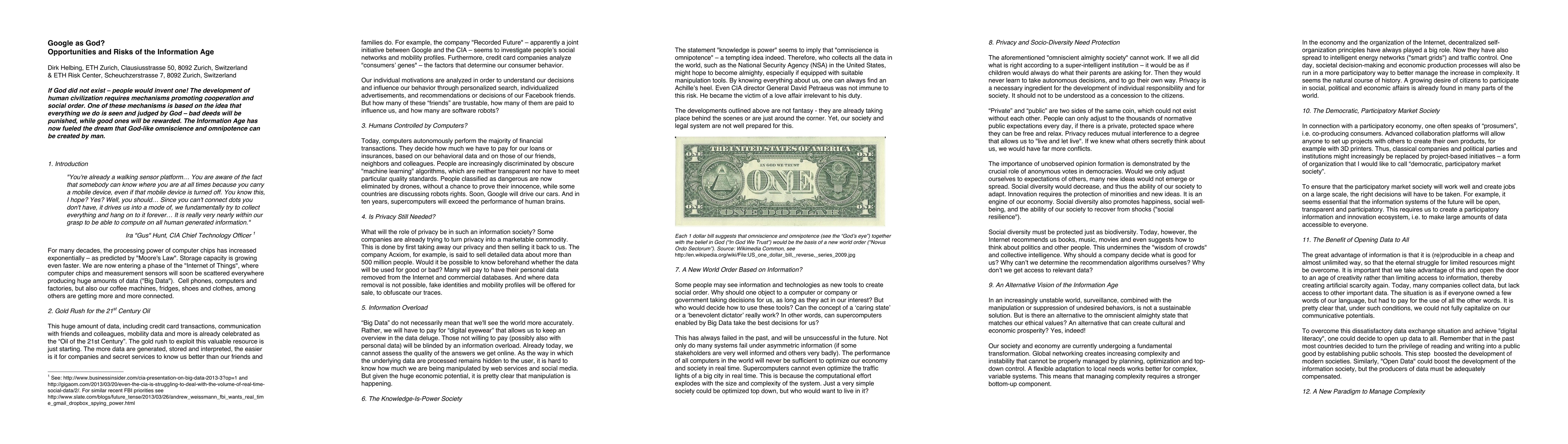 This paper explores the emergence of powerful entities like Google as quasi-divine overseers in the Information Age, examining both the cooperative and social order benefits they offer, as well as the inherent risks and ethical concerns they pose. It questions whether these technological advancements could lead to new forms of surveillance and control.