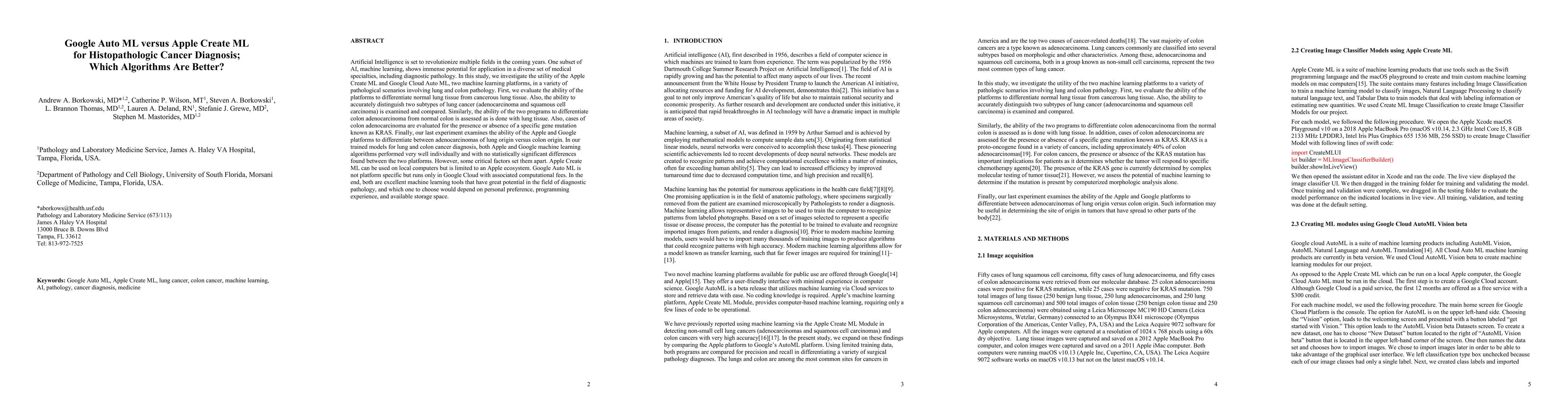Artificial Intelligence is set to revolutionize multiple fields in the coming years. One subset of AI, machine learning, shows immense potential for application in a diverse set of medical specialties, including diagnostic pathology. In this study, we investigate the utility of the Apple Create ML and Google Cloud Auto ML, two machine learning platforms, in a variety of pathological scenarios involving lung and colon pathology. First, we evaluate the ability of the platforms to differentiate normal lung tissue from cancerous lung tissue. Also, the ability to accurately distinguish two subtypes of lung cancer (adenocarcinoma and squamous cell carcinoma) is examined and compared. Similarly, the ability of the two programs to differentiate colon adenocarcinoma from normal colon is assessed as is done with lung tissue. Also, cases of colon adenocarcinoma are evaluated for the presence or absence of a specific gene mutation known as KRAS. Finally, our last experiment examines the ability of the Apple and Google platforms to differentiate between adenocarcinomas of lung origin versus colon origin. In our trained models for lung and colon cancer diagnosis, both Apple and Google machine learning algorithms performed very well individually and with no statistically significant differences found between the two platforms. However, some critical factors set them apart. Apple Create ML can be used on local computers but is limited to an Apple ecosystem. Google Auto ML is not platform specific but runs only in Google Cloud with associated computational fees. In the end, both are excellent machine learning tools that have great potential in the field of diagnostic pathology, and which one to choose would depend on personal preference, programming experience, and available storage space.