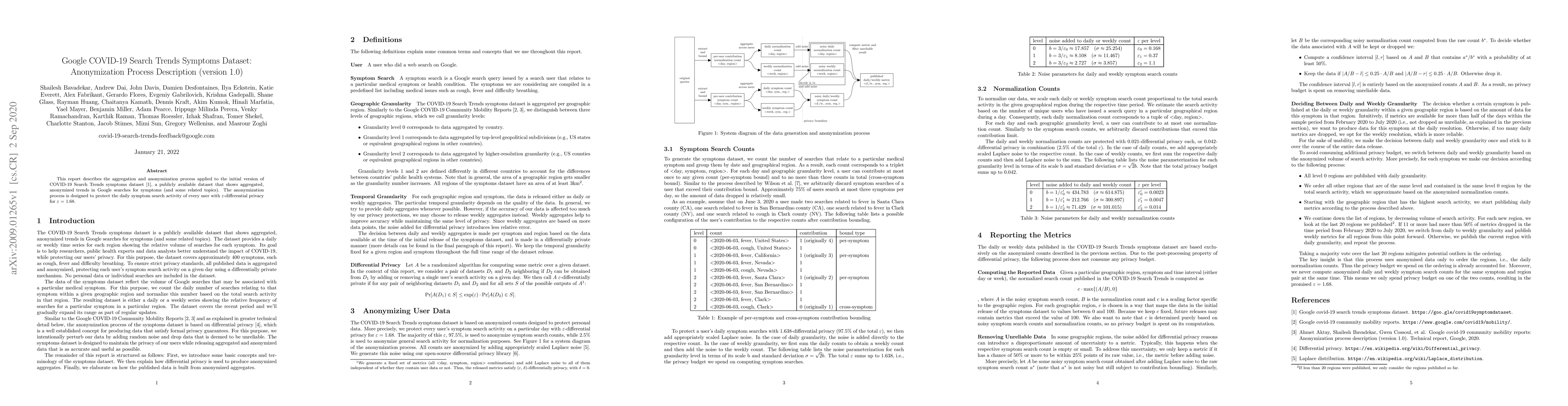 This report describes the aggregation and anonymization process applied to the initial version of COVID-19 Search Trends symptoms dataset (published at https://goo.gle/covid19symptomdataset on September 2, 2020), a publicly available dataset that shows aggregated, anonymized trends in Google searches for symptoms (and some related topics). The anonymization process is designed to protect the daily symptom search activity of every user with $\varepsilon$-differential privacy for $\varepsilon$ = 1.68.