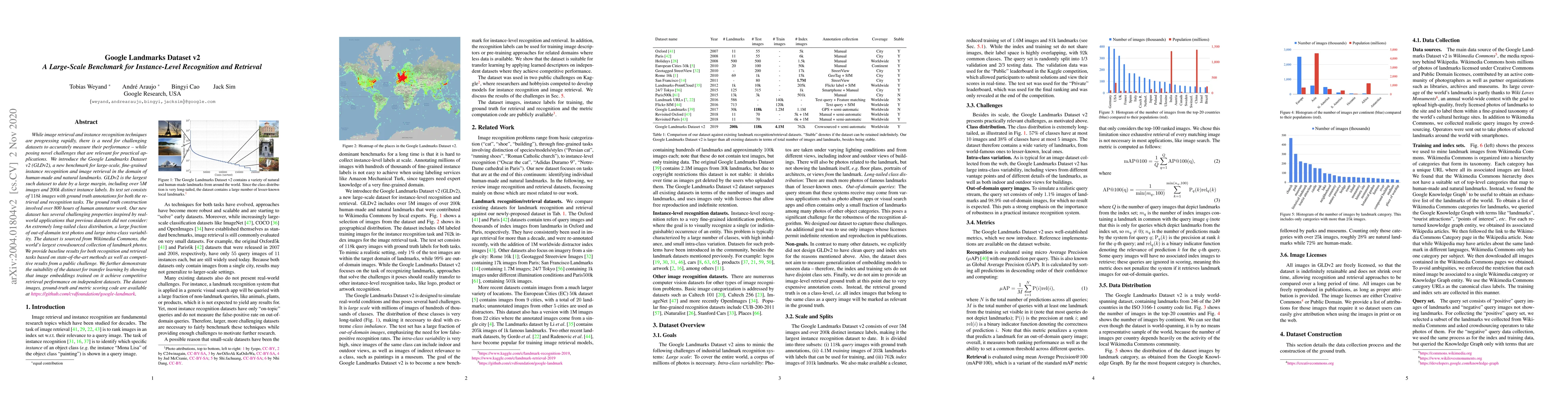 The Google Landmarks Dataset v2 (GLDv2) is a large-scale benchmark for fine-grained instance recognition and image retrieval, featuring over 5M images and 200k distinct instance labels. It includes challenging properties like long-tailed class distribution and large intra-class variability, making it suitable for evaluating and advancing real-world applications.