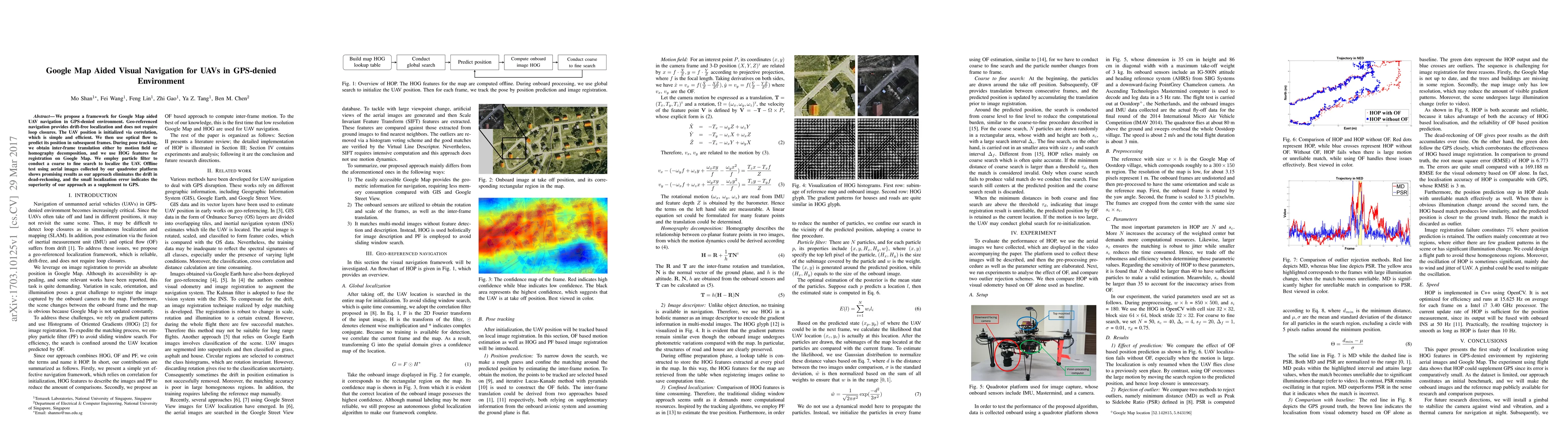 This paper proposes a Google Map aided visual navigation framework for UAVs in GPS-denied environments, utilizing geo-referenced navigation, optical flow, and HOG features for localization, and demonstrating drift-free performance with minimal error through offline tests.