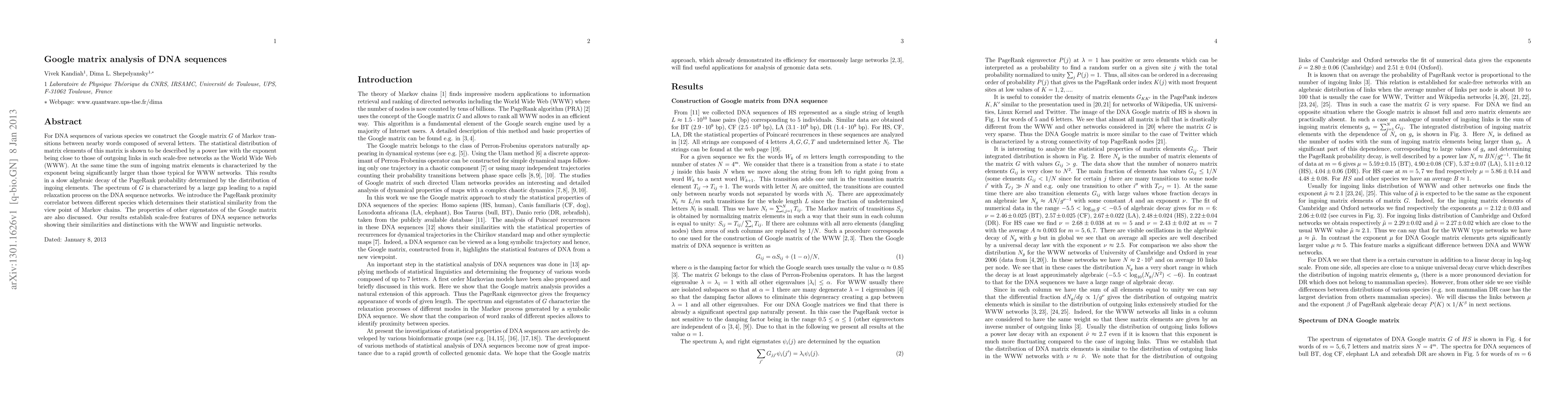 This paper analyzes the Google matrix of DNA sequences, revealing a power-law distribution in its elements akin to scale-free networks like the WWW, with a slower decay in the PageRank probability due to larger ingoing element exponents. The study also introduces a PageRank proximity correlator to measure species similarity via Markov chains, highlighting the unique spectral properties of DNA sequence networks compared to linguistic and WWW networks.
