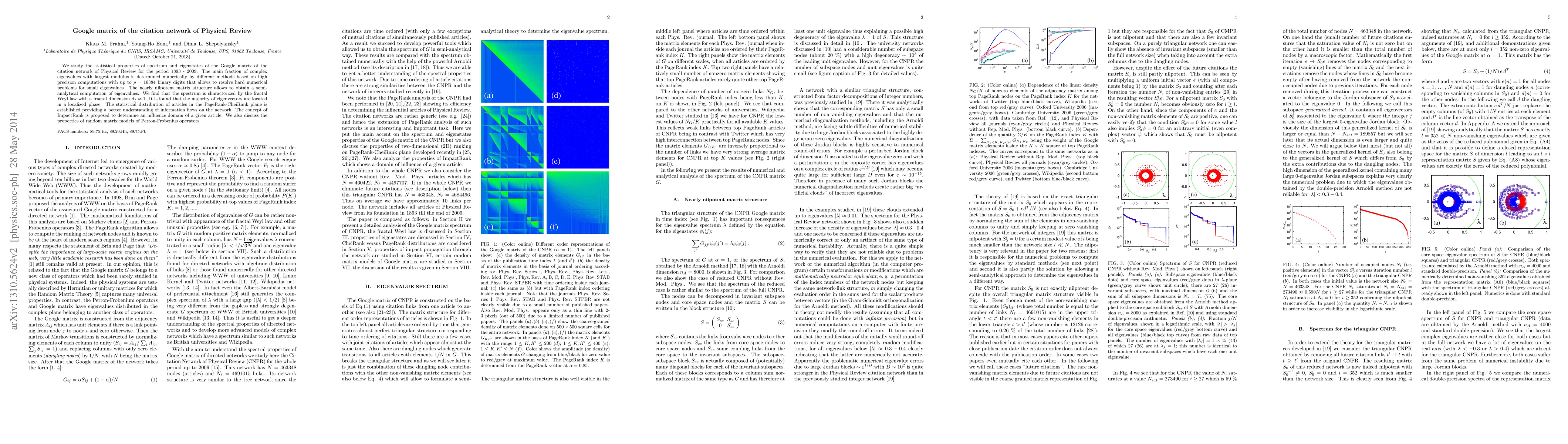 This paper investigates the Google matrix of the Physical Review citation network from 1893 to 2009, revealing a fractal Weyl law for its spectrum and localized eigenvectors. The study proposes the ImpactRank concept to assess article influence and discusses random matrix models of Perron-Frobenius operators.