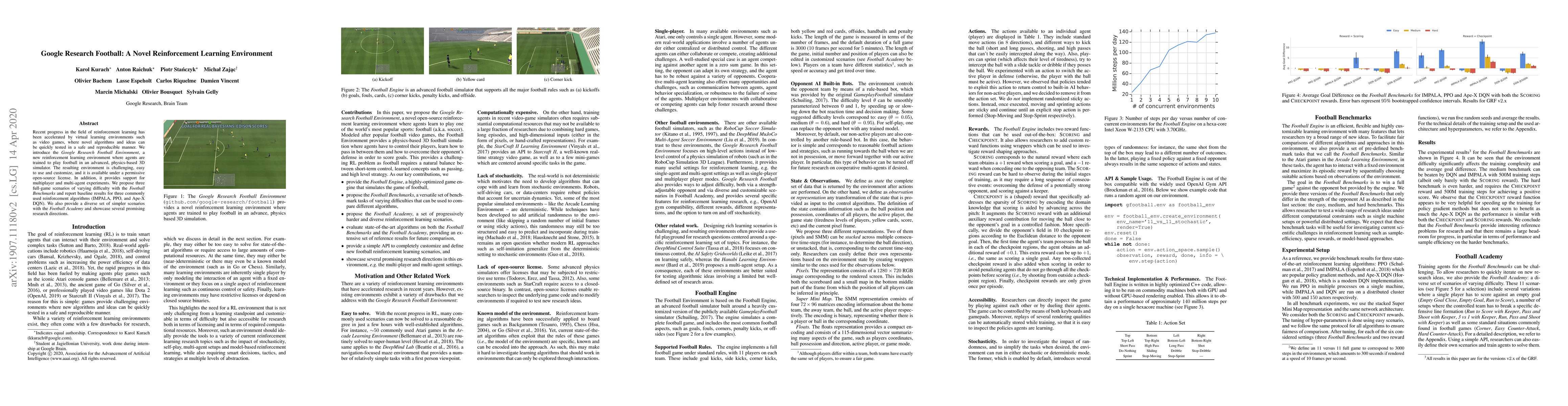 This paper introduces the Google Research Football Environment, a reinforcement learning platform featuring a 3D physics-based football simulator designed for testing novel algorithms. It offers challenging, customizable scenarios and baseline results for three reinforcement learning methods, aiming to advance research in the field.