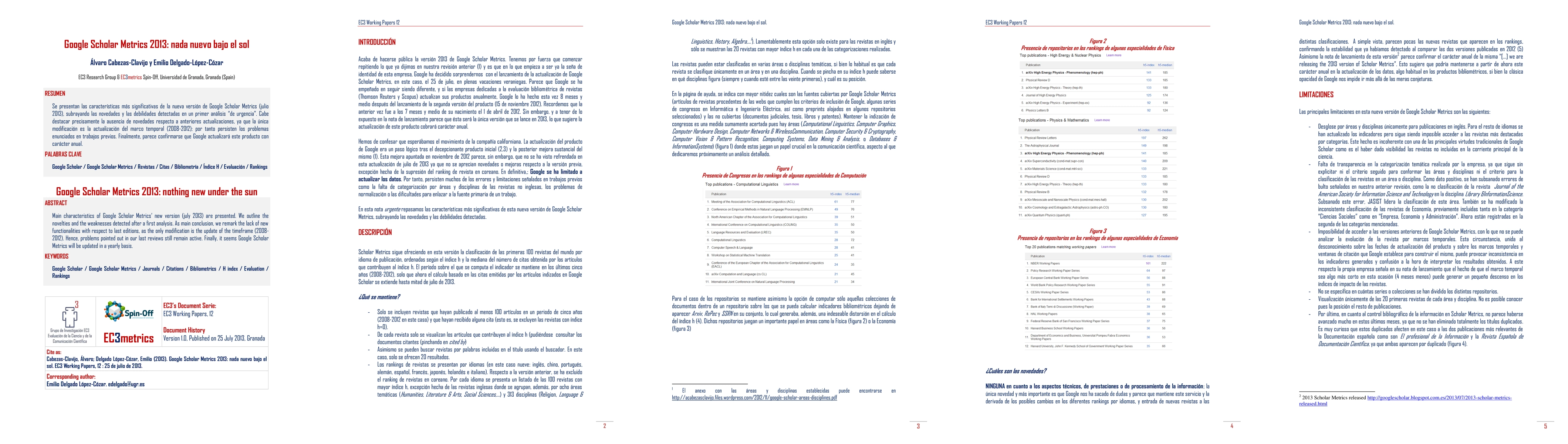 Summary: The 2013 version of Google Scholar Metrics introduces no significant new functionalities beyond updating the timeframe to 2008-2012, maintaining the same issues identified in previous reviews, and indicating an annual update schedule.
