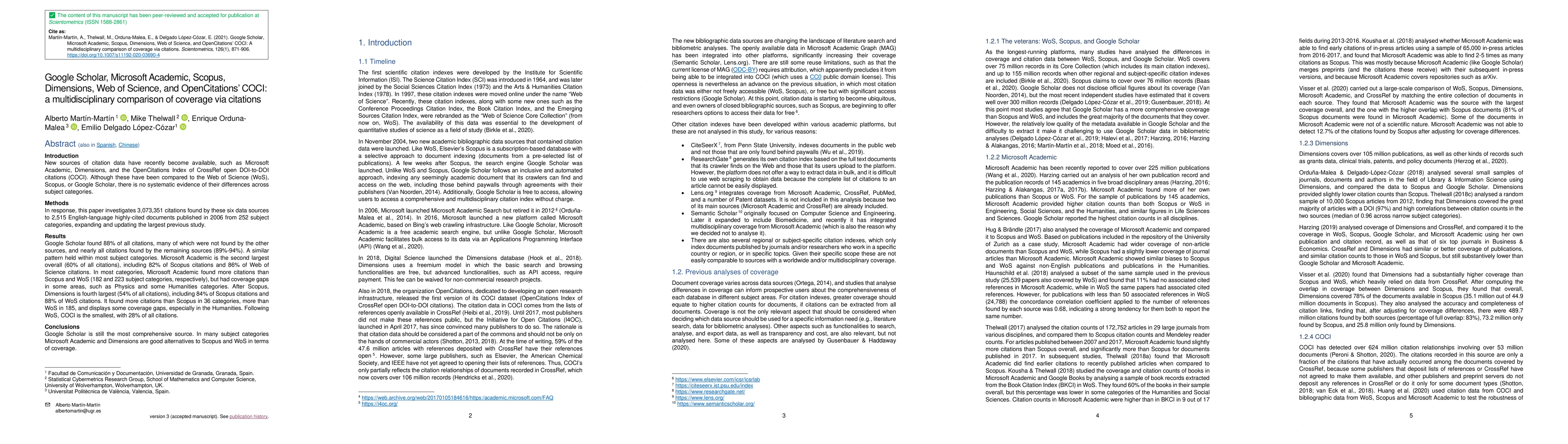 This paper compares the citation coverage of six citation databases—Google Scholar, Microsoft Academic, Scopus, Dimensions, Web of Science, and OpenCitations' COCI—across 252 subject categories. Google Scholar found the most citations (88%), often unique to it, while Microsoft Academic was the second largest (60%) and often outperformed Scopus and Web of Science in specific categories.