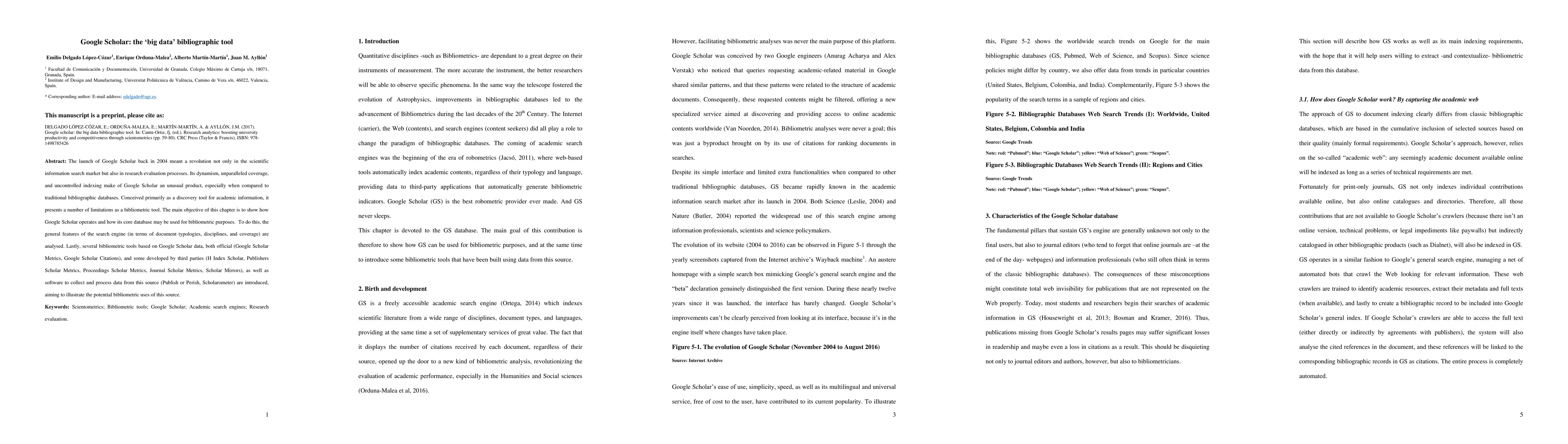 The launch of Google Scholar back in 2004 meant a revolution not only in the scientific information search market but also in research evaluation processes. Its dynamism, unparalleled coverage, and uncontrolled indexing make of Google Scholar an unusual product, especially when compared to traditional bibliographic databases. Conceived primarily as a discovery tool for academic information, it presents a number of limitations as a bibliometric tool. The main objective of this chapter is to show how Google Scholar operates and how its core database may be used for bibliometric purposes. To do this, the general features of the search engine (in terms of document typologies, disciplines, and coverage) are analysed. Lastly, several bibliometric tools based on Google Scholar data, both official (Google Scholar Metrics, Google Scholar Citations), and some developed by third parties (H Index Scholar, Publishers Scholar Metrics, Proceedings Scholar Metrics, Journal Scholar Metrics, Scholar Mirrors), as well as software to collect and process data from this source (Publish or Perish, Scholarometer) are introduced, aiming to illustrate the potential bibliometric uses of this source.
