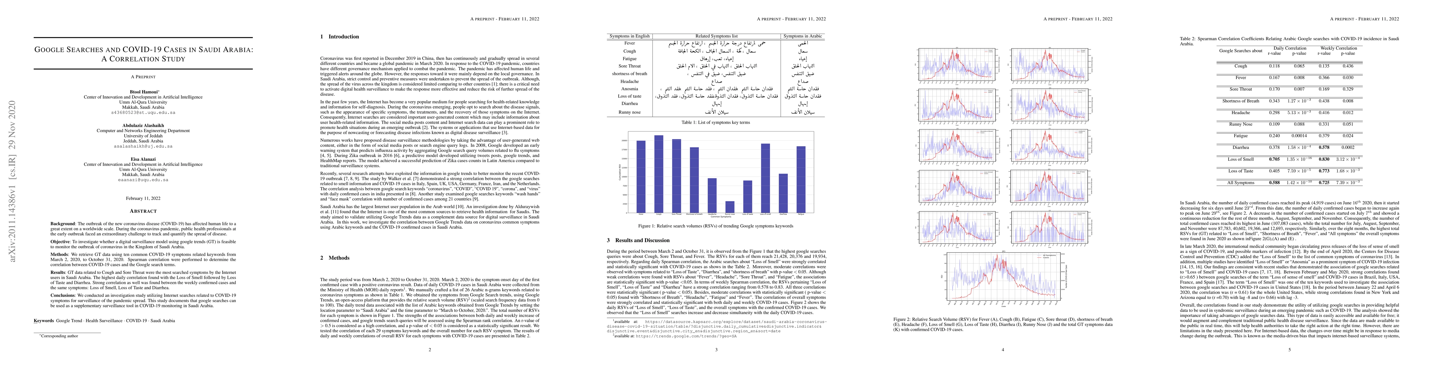 This study investigates the correlation between Google search trends for COVID-19 symptoms and confirmed COVID-19 cases in Saudi Arabia from March 2020 to October 2020. The findings suggest that Google searches for specific symptoms like Loss of Smell, Loss of Taste, and Diarrhea can serve as a supplementary surveillance tool for monitoring the spread of COVID-19.