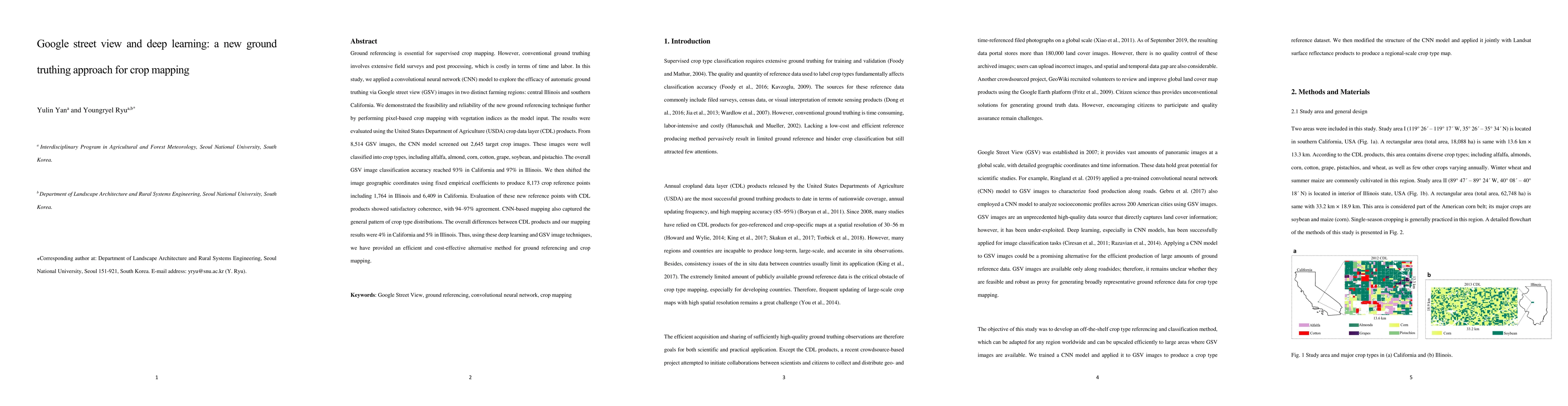 This research explores the use of convolutional neural networks (CNNs) and Google Street View (GSV) images for automated ground truthing in crop mapping, demonstrating high accuracy and efficiency compared to traditional methods. The study successfully classified crop types in two regions, achieving 93% accuracy in California and 97% in Illinois, and showed strong agreement with USDA crop data.