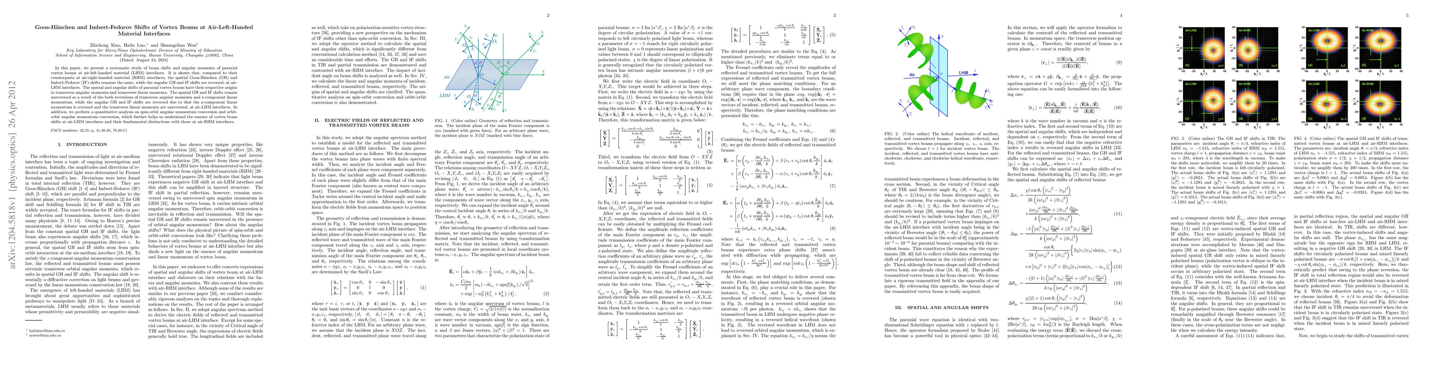 This paper investigates the Goos-Hänchen and Imbert-Fedorov shifts of vortex beams at air-left-handed material interfaces, revealing that spatial shifts remain unchanged while angular shifts reverse, due to the interplay of transverse angular and linear momenta. It also analyzes spin-orbit and orbit-orbit angular momentum conversions to distinguish these shifts from those at air-right-handed material interfaces.