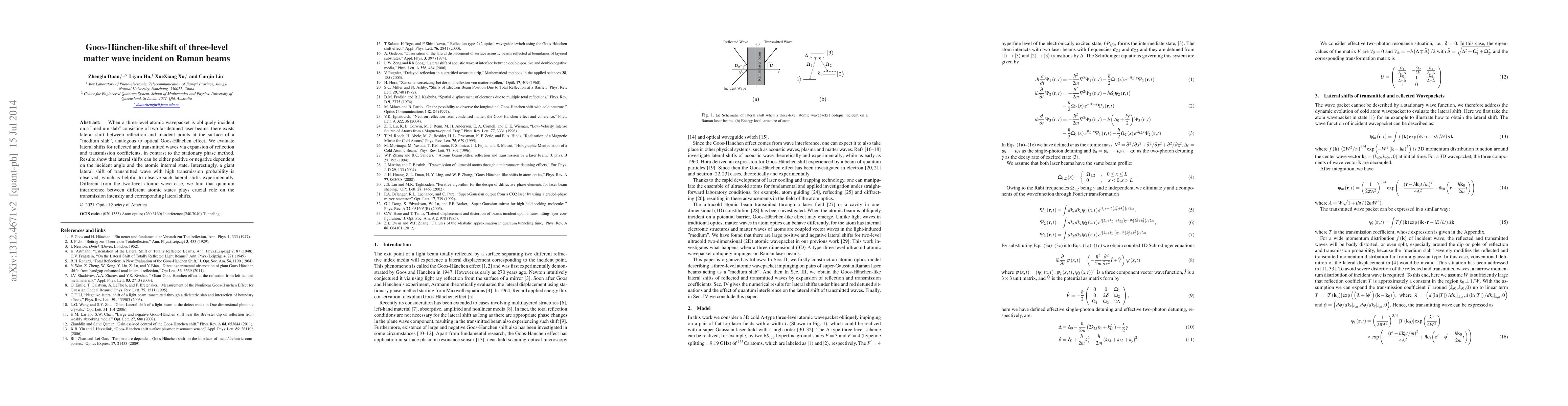 This paper investigates the lateral shift of a three-level atomic wavepacket reflected and transmitted through a medium slab with Raman beams, revealing a Goos-Hanchen-like effect. The study finds that shifts can be positive or negative, influenced by the incident angle and atomic state, with significant quantum interference effects impacting transmission intensity and shifts.