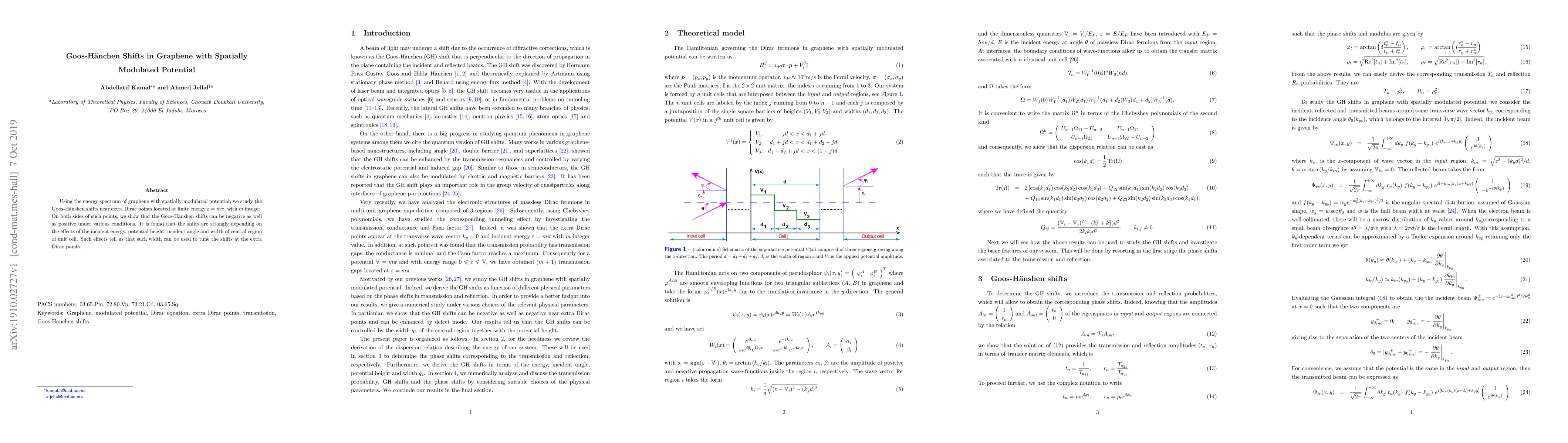 Using the energy spectrum of graphene with spatially modulated potential, we study the Goos-H\"anshen shifts near extra Dirac points located at finite energy $\varepsilon=m\pi$, with $m$ integer. On both sides of such points, we show that the Goos-H\"anshen shifts can be negative as well as positive under various conditions. It is found that the shifts are strongly depending on the effects of the incident energy, potential height, incident angle and width of central region of unit cell. Such effects tell us that such width can be used to tune the shifts at the extra Dirac points.