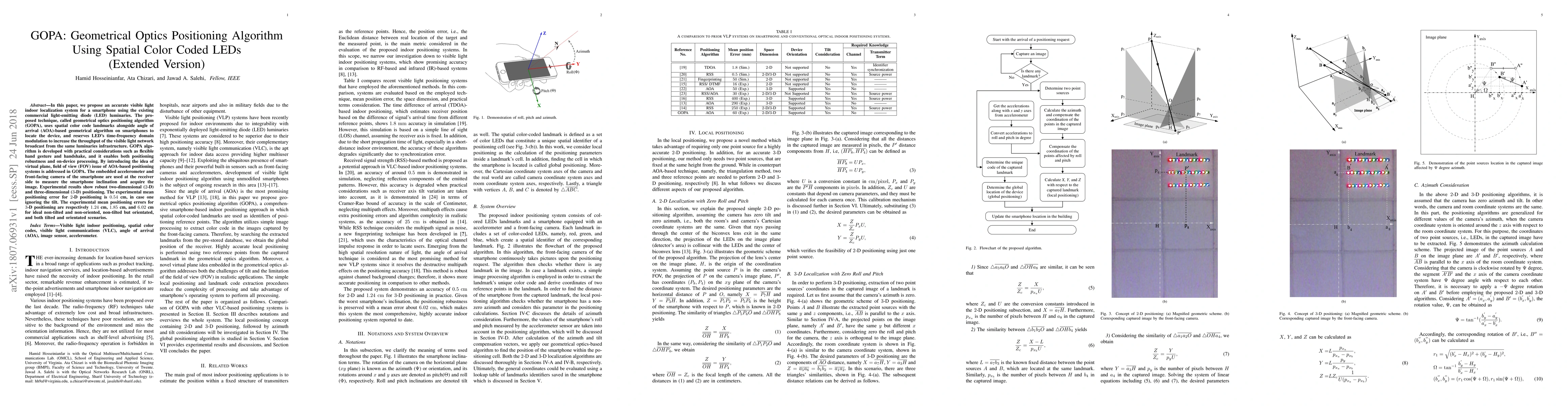 This paper introduces GOPA, a visible light indoor localization system for smartphones using commercial LEDs, which employs spatial color codes and angle of arrival algorithms for precise positioning. Experimental results demonstrate robust two-dimensional and three-dimensional positioning with minimal mean errors, highlighting the system's practical applicability and accuracy.