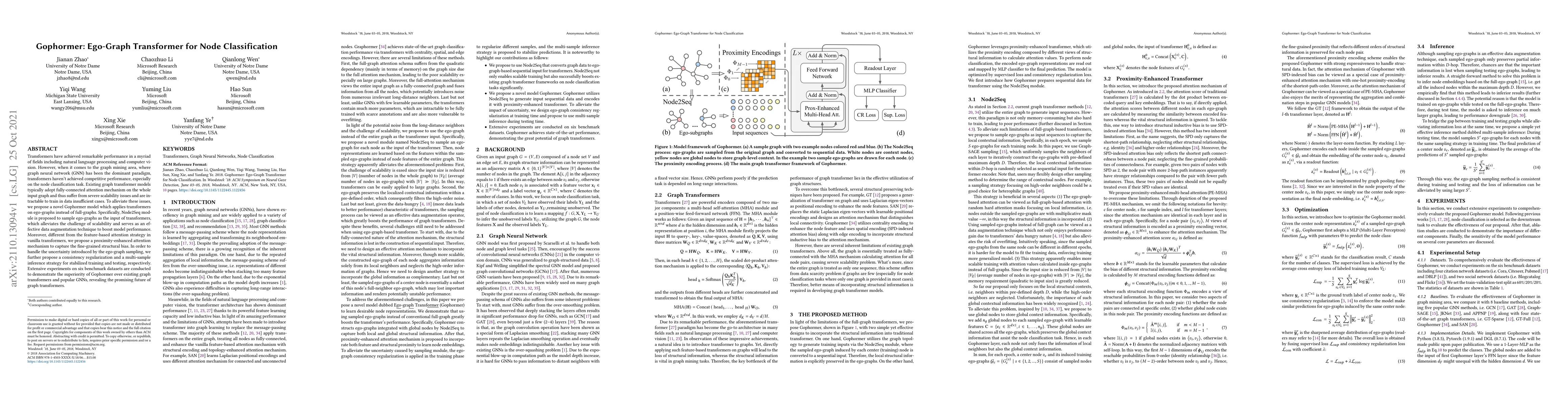 The Gophormer model leverages transformers on ego-graphs instead of full graphs to enhance scalability and performance for node classification tasks, employing a Node2Seq module and a proximity-enhanced attention mechanism, and utilizing consistency regularization and multi-sample inference for stable training and testing. Experimental results show Gophormer outperforms existing graph transformers and GNNs on benchmark datasets.